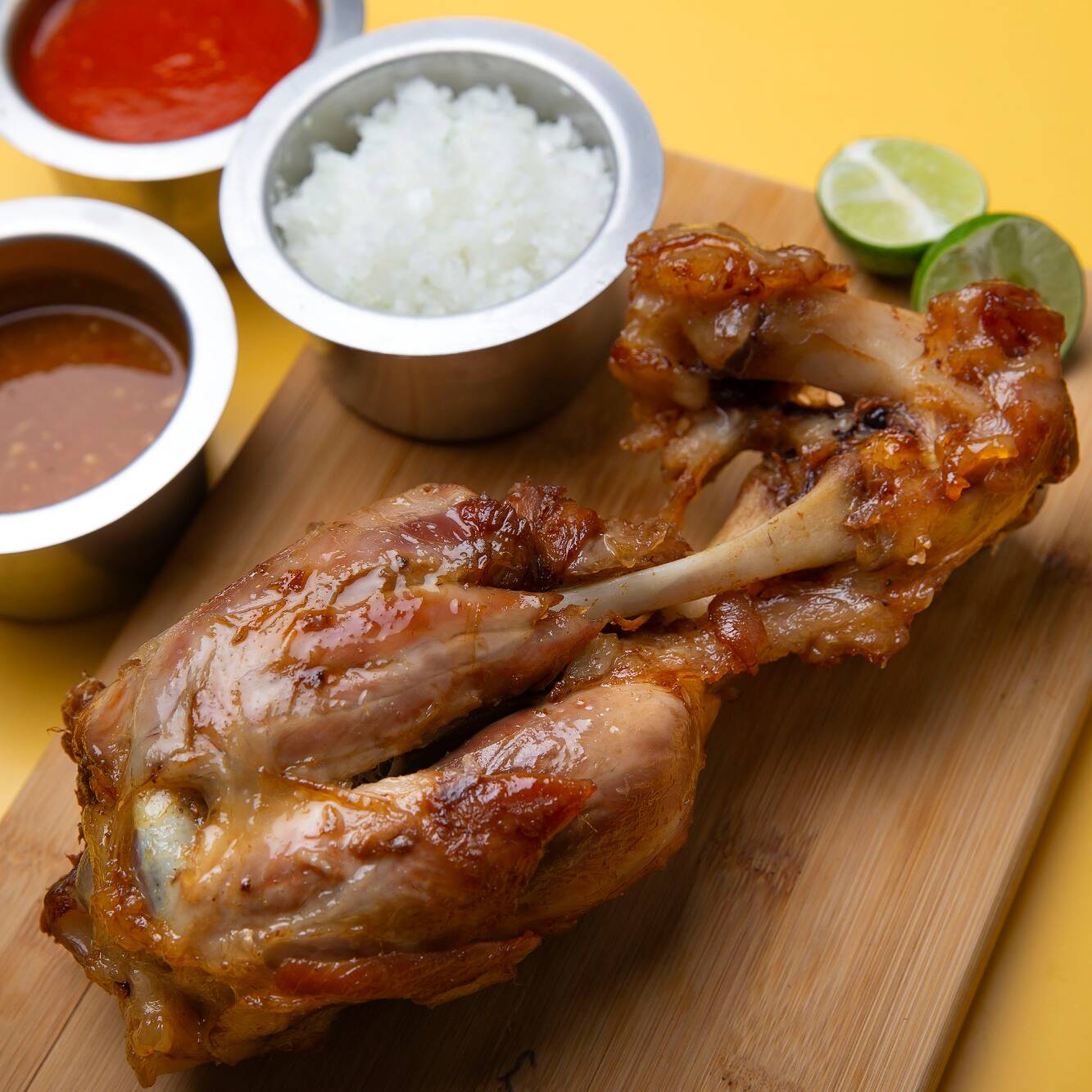 1 Chamorro con tortillas, limón, cebolla, salsa roja, salsa verde y chiles en vinagre.
