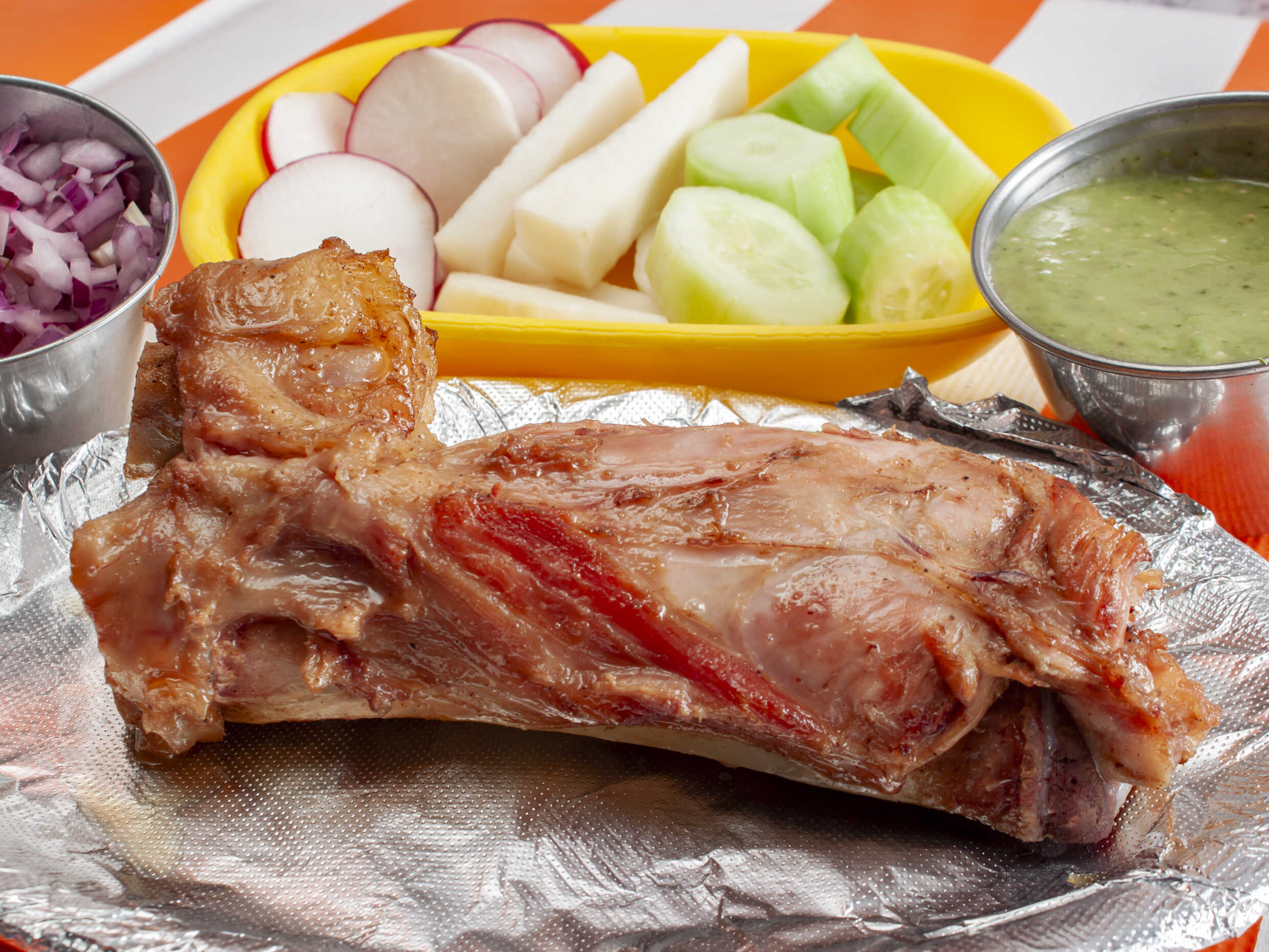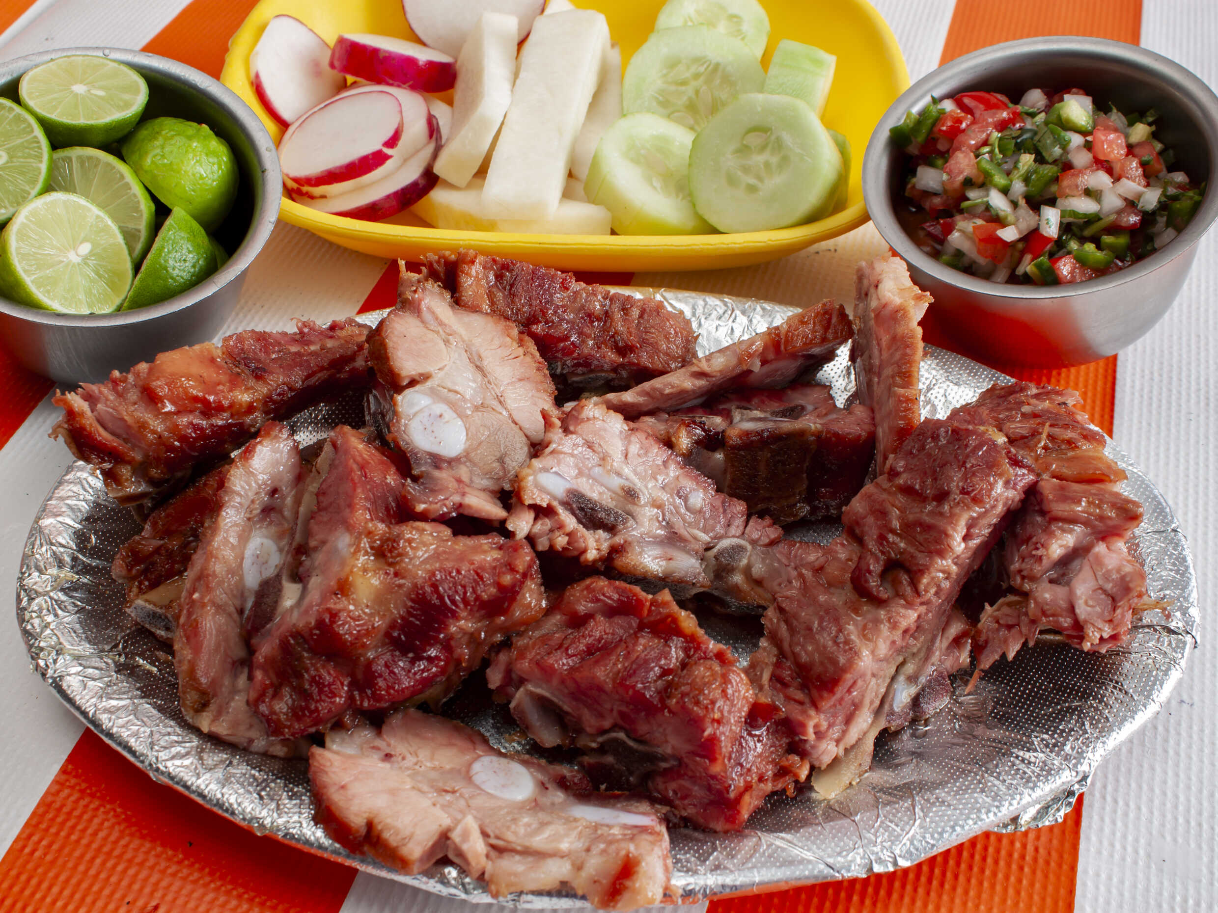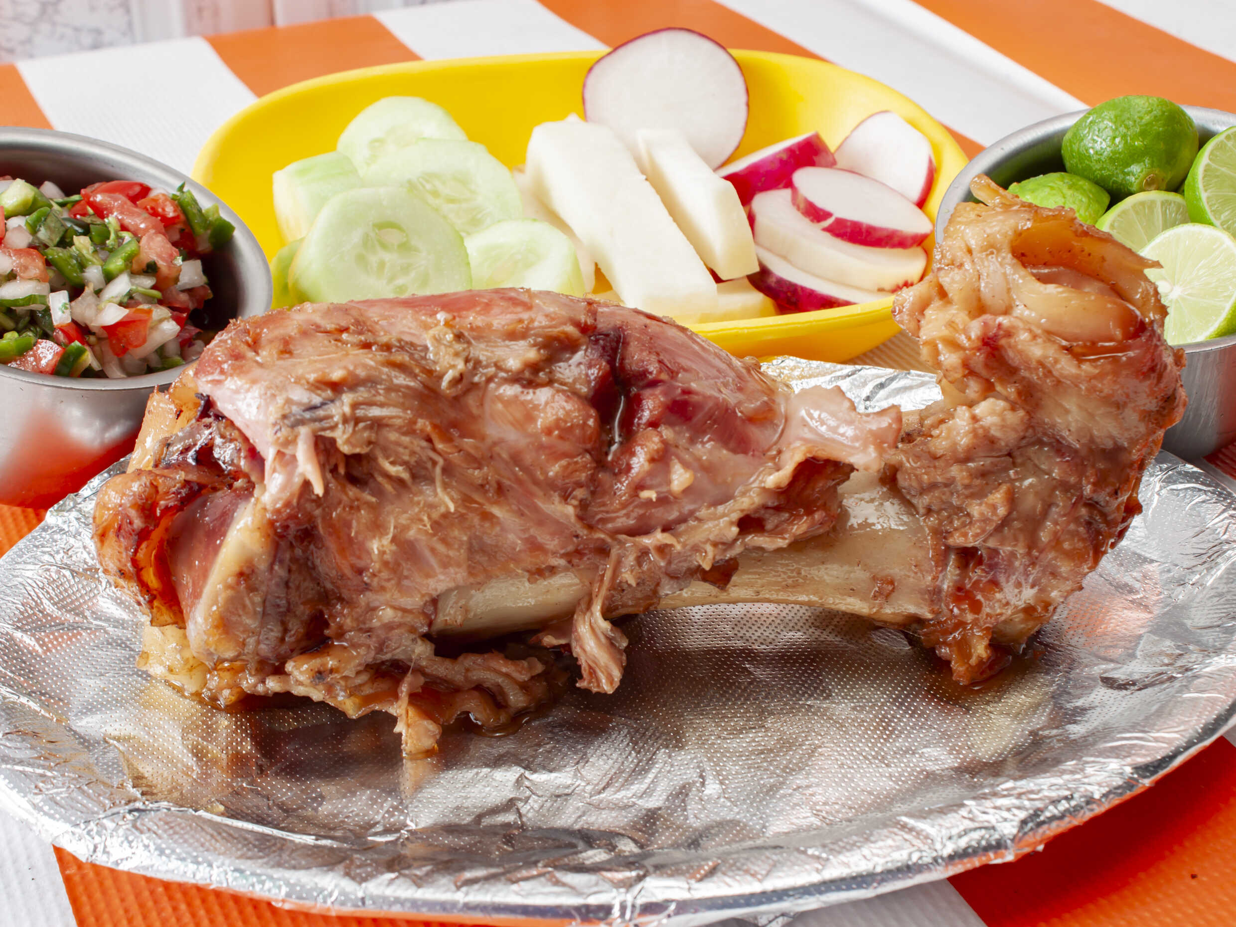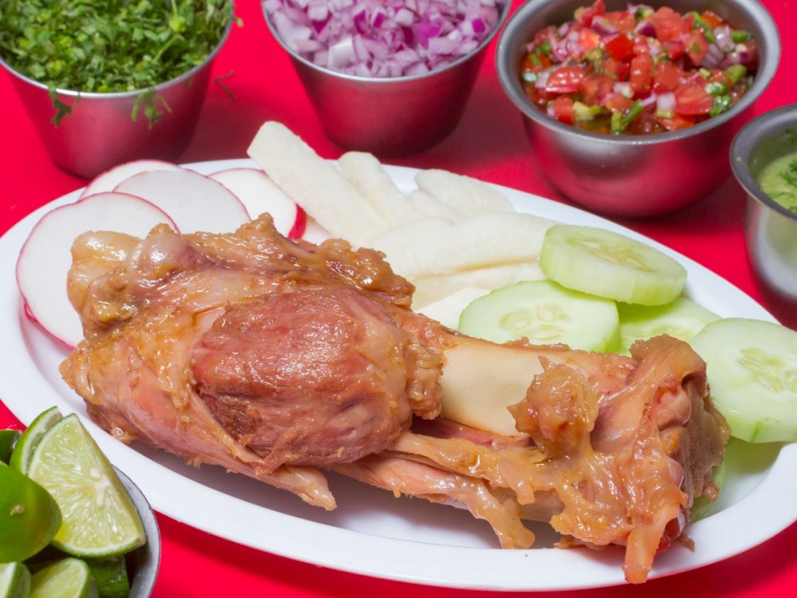 Acompañado de jícamas, pepino, rábanos y tortillas.