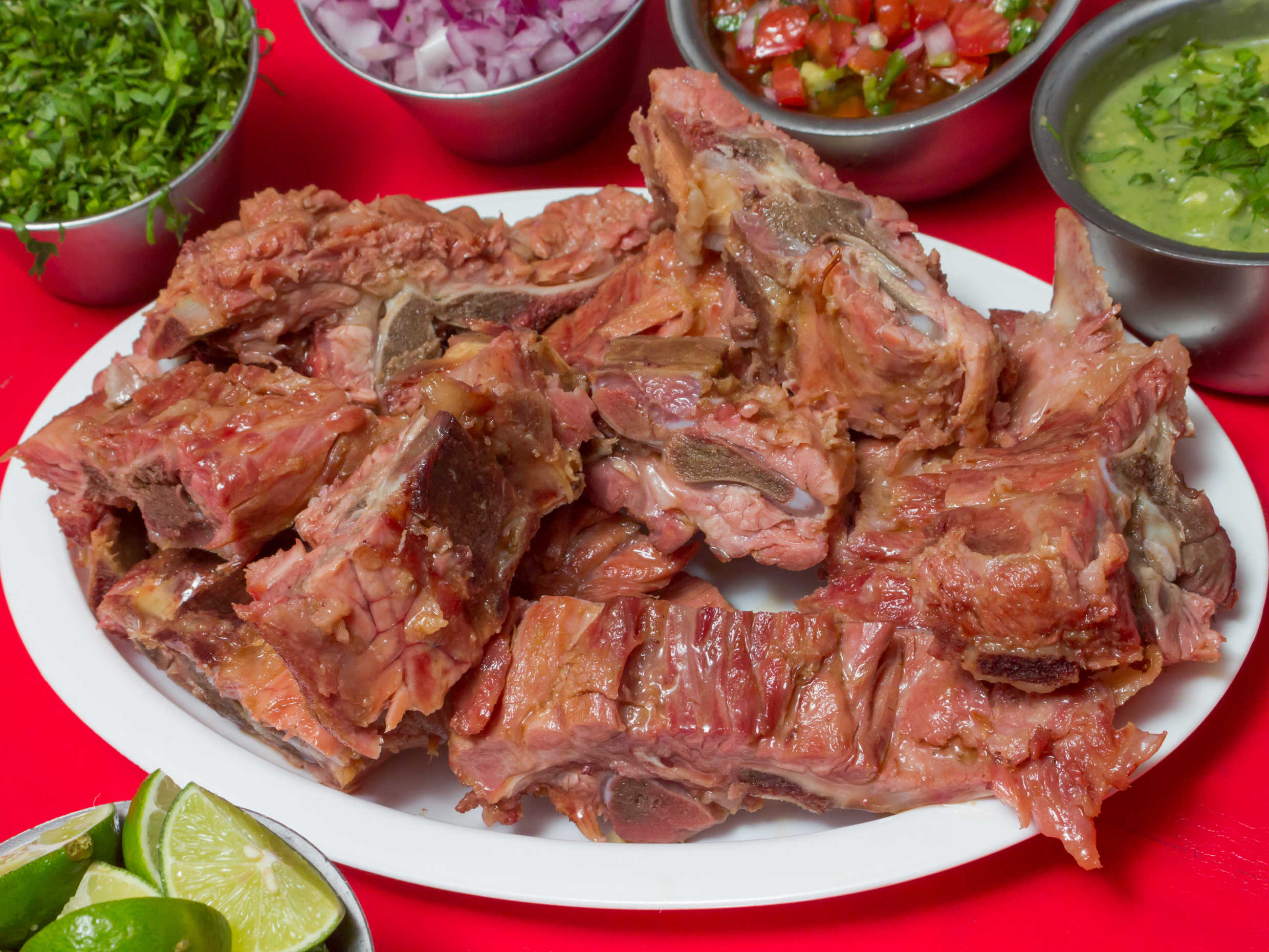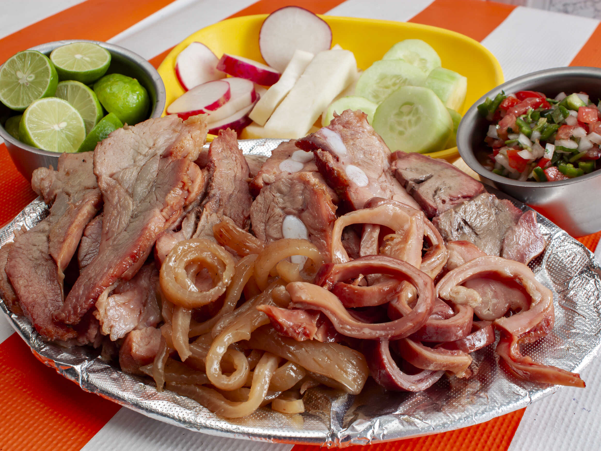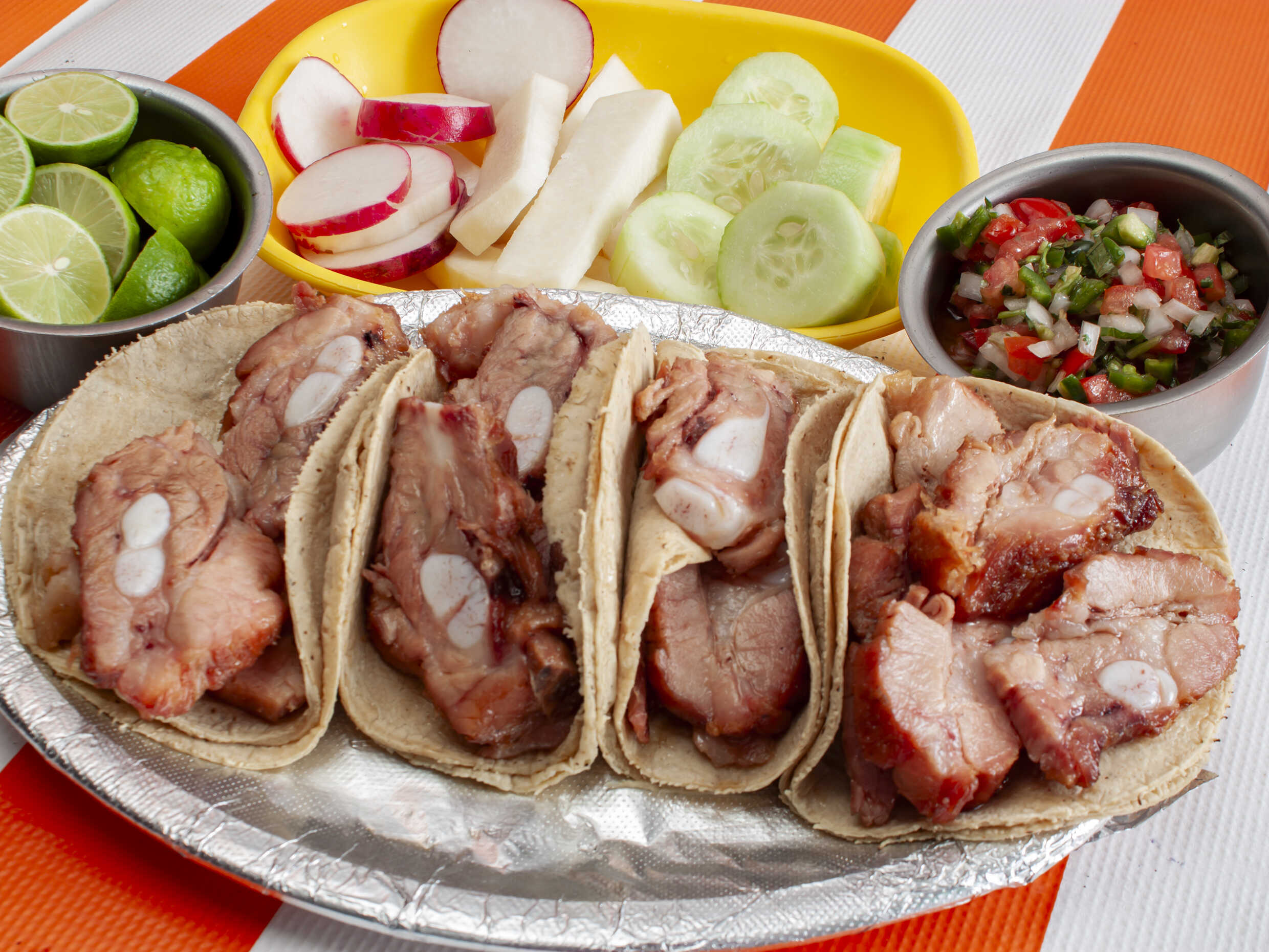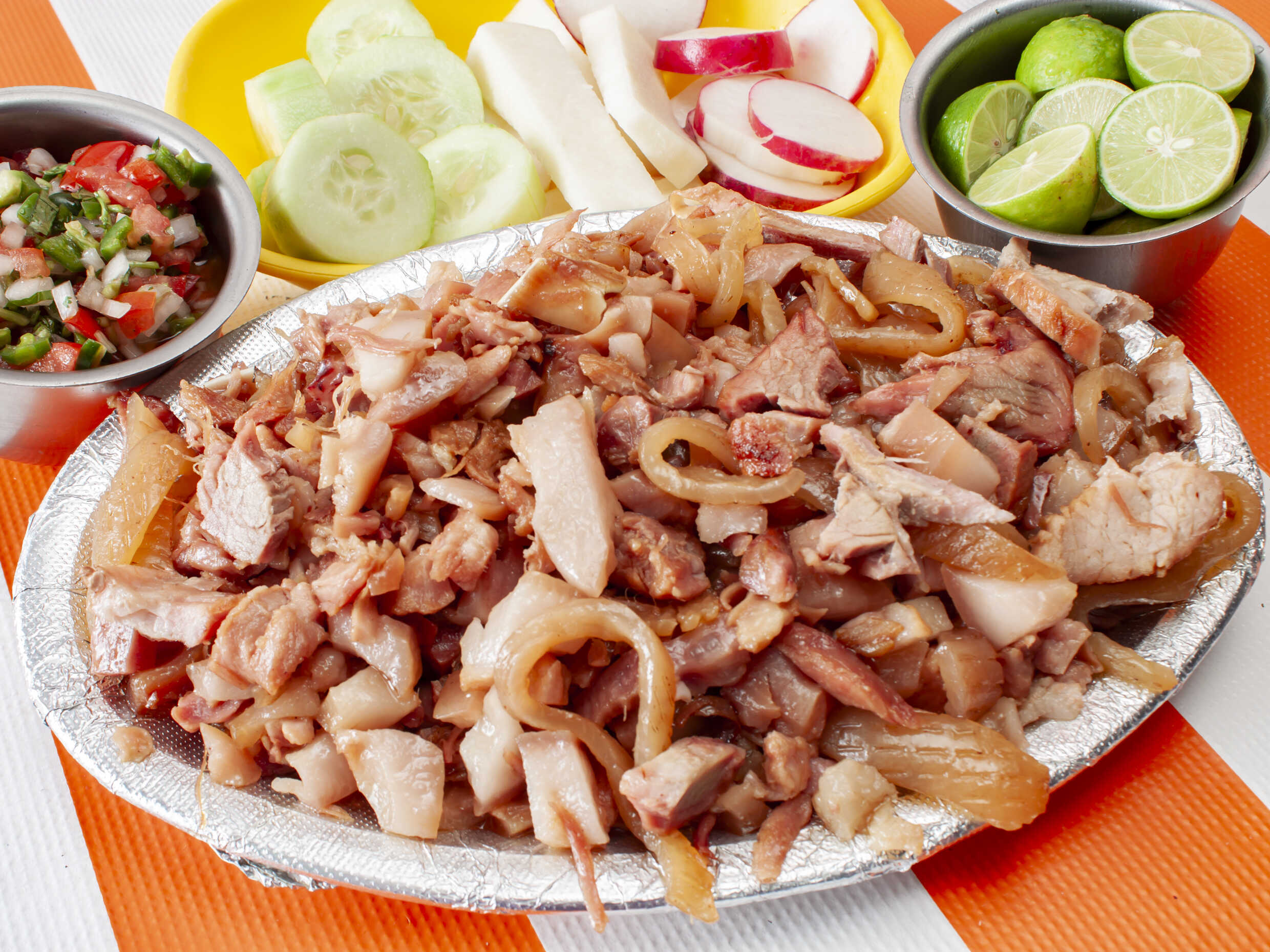 Acompañado de jícamas, pepino, rábanos y tortillas.