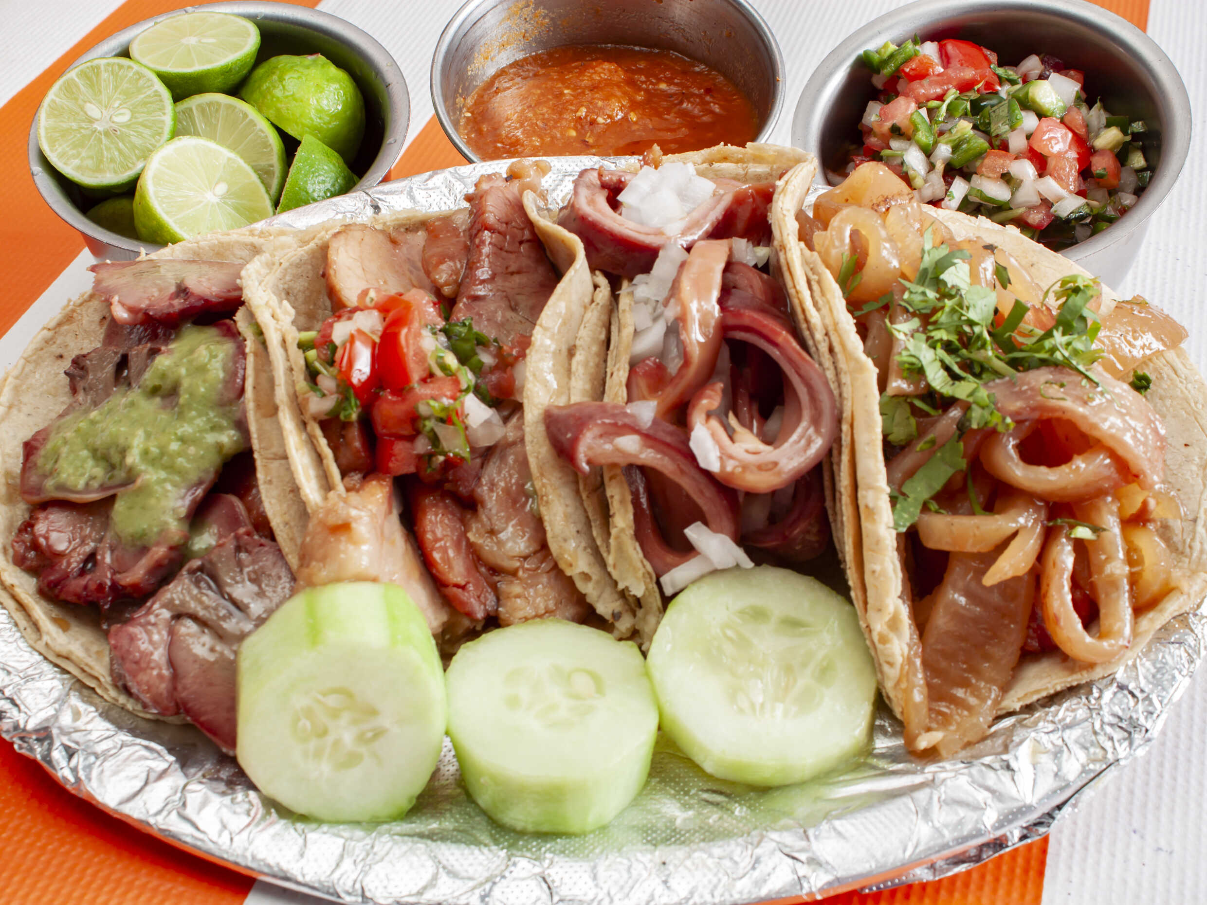 4 Tacos de surtida (surtida económica: está mezcla trae todas las piezas a la misma proporción excepto costilla y nana) incluye 1 refresco Big Cola de 300 ml.