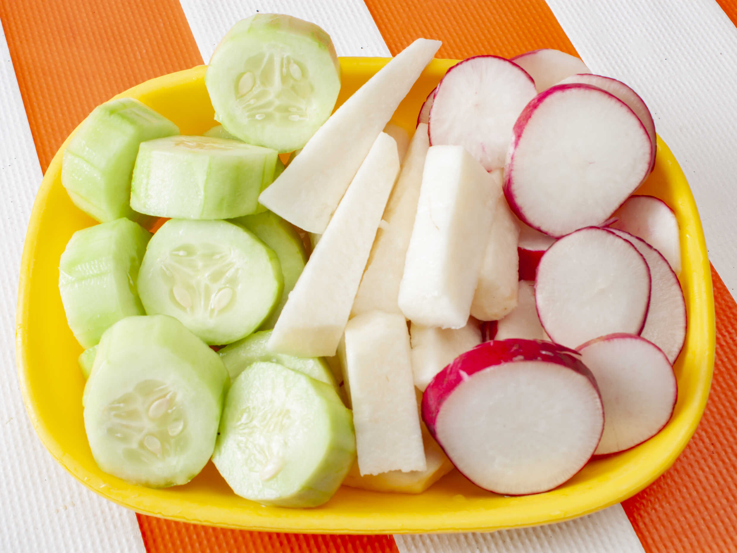 Fresca ensalada con jícamas, pepinos y rábanos con verduras seleccionadas muy frescas para acompañar tus carnitas.