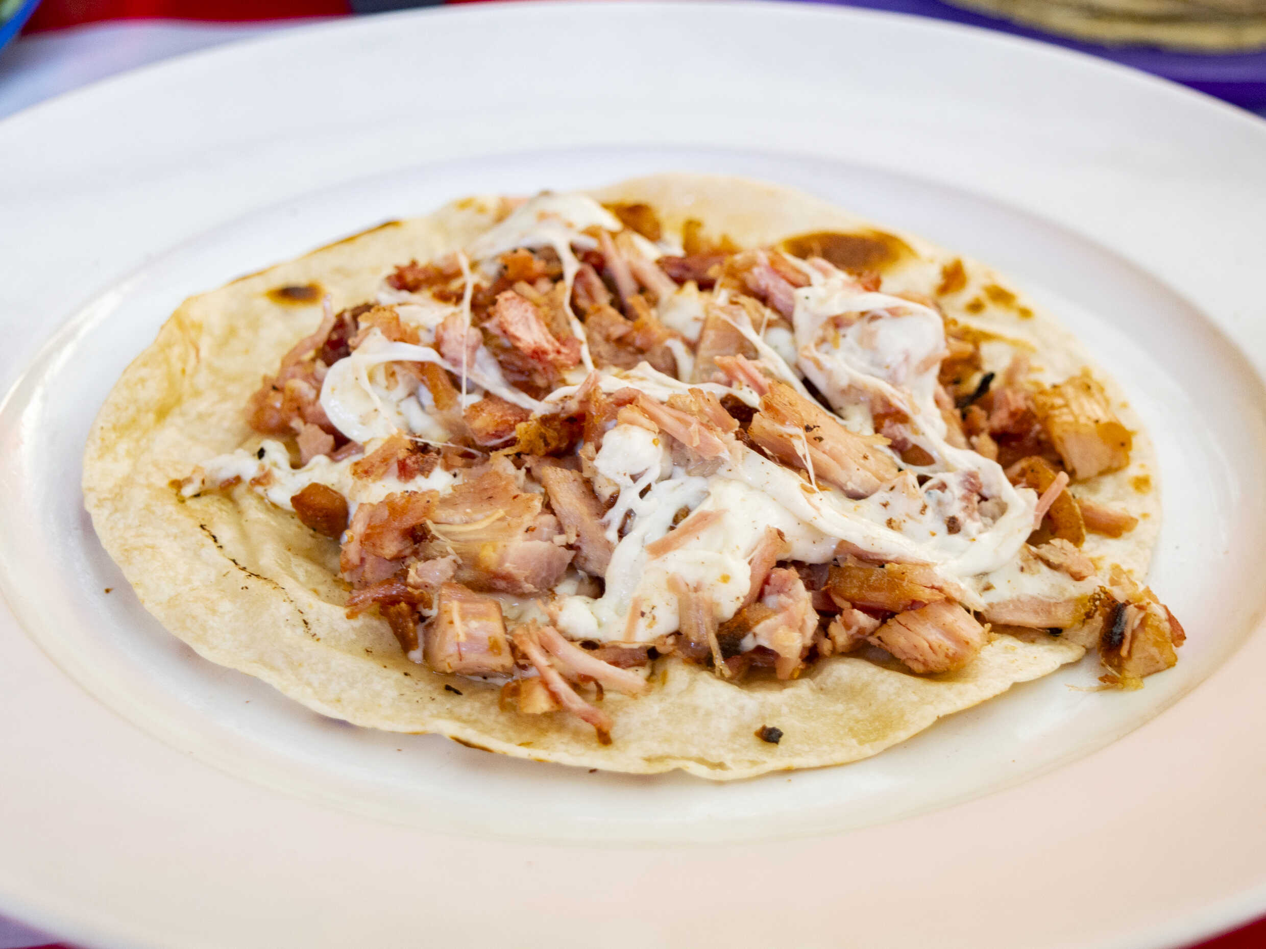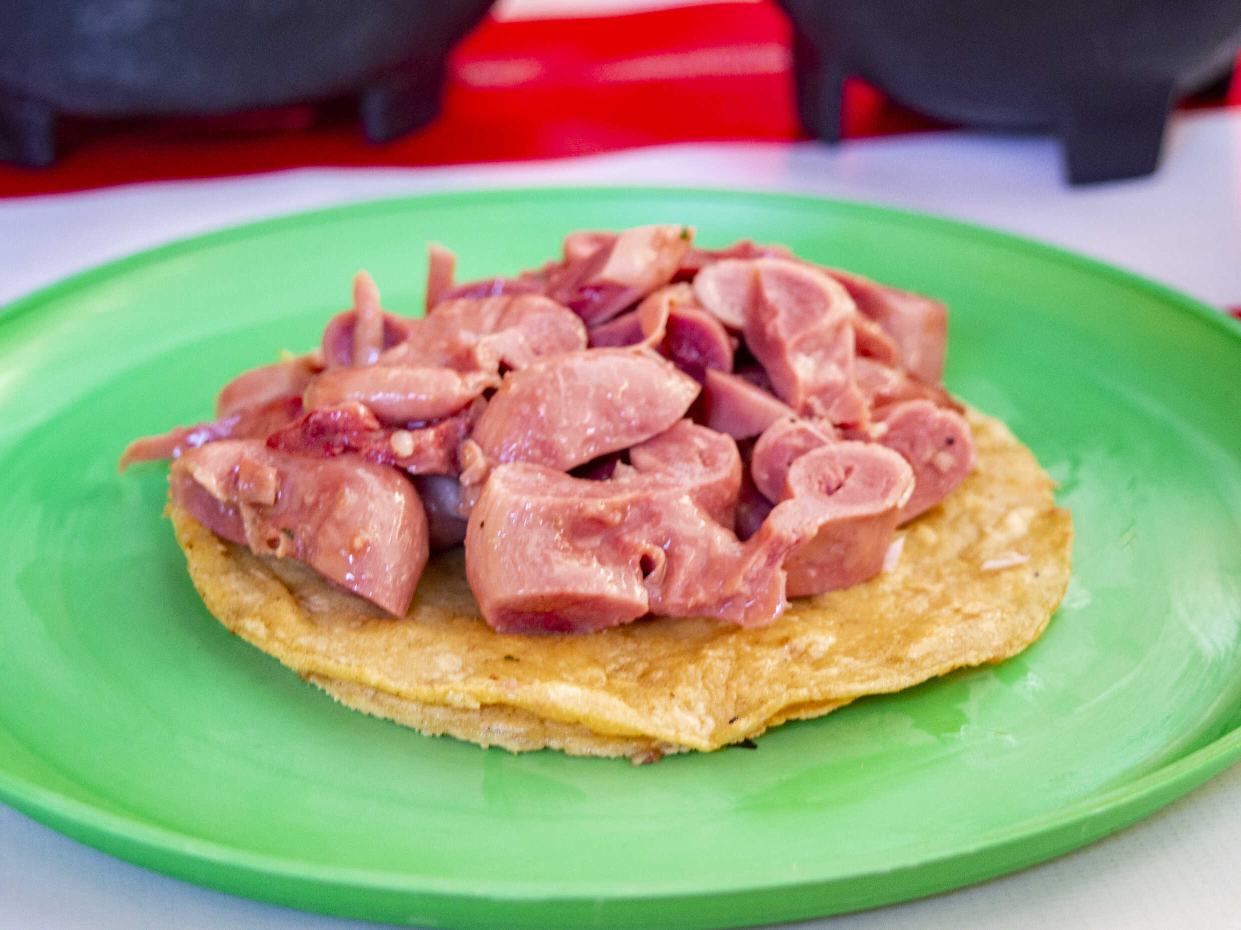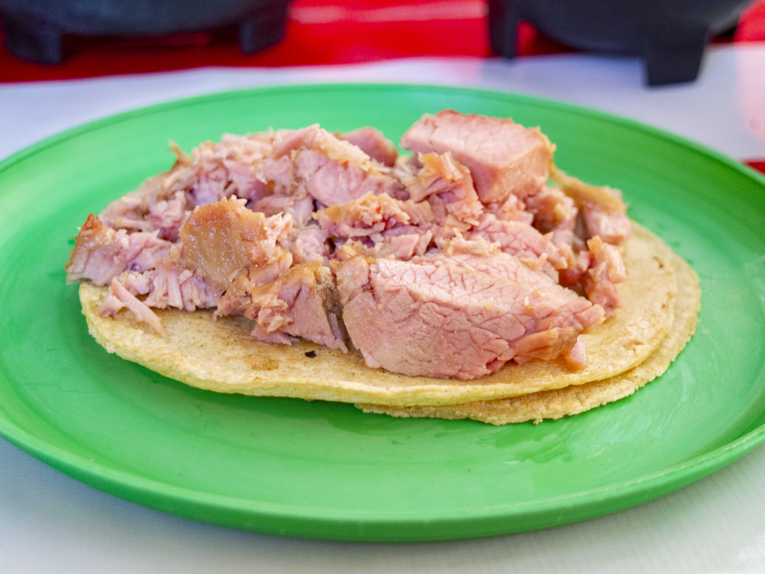 Cesadilla normal con epazote,cebolla , sesos de puerco y se le agregan carnitas al gusto.