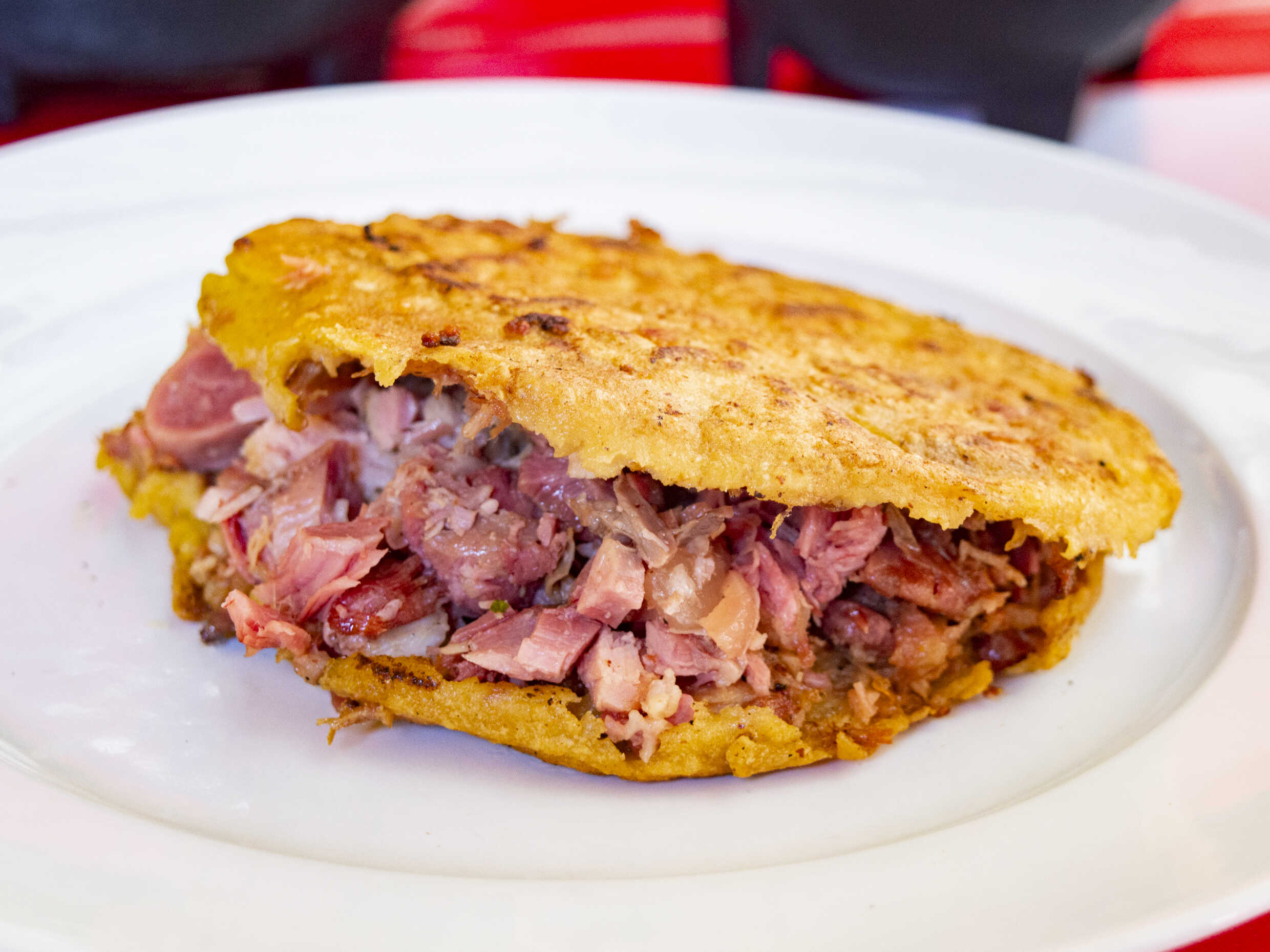 Porcion personal: Deliciosa gordita de (160gr) con maciza, buche, nana, cuero, barriga, oreja, trompa y costilla (Surtida entre todas las carnes) + Salsas + verduras(aparte).