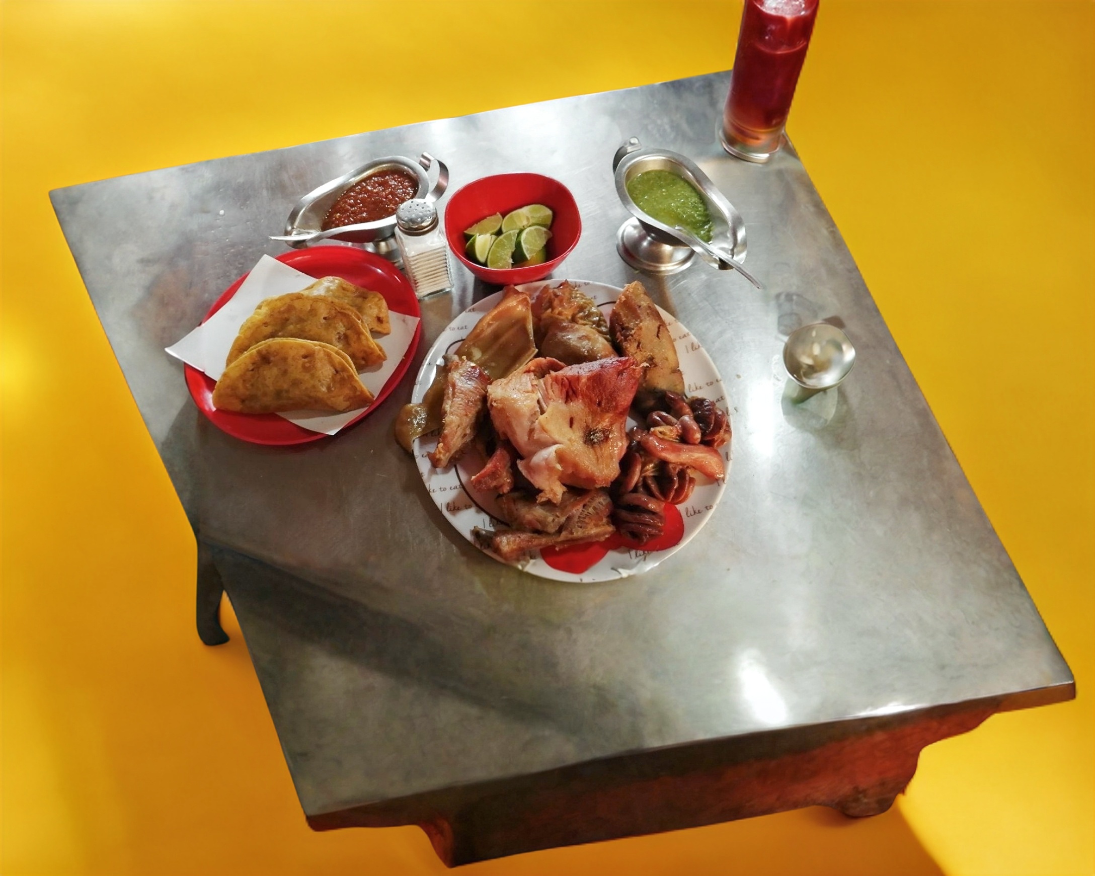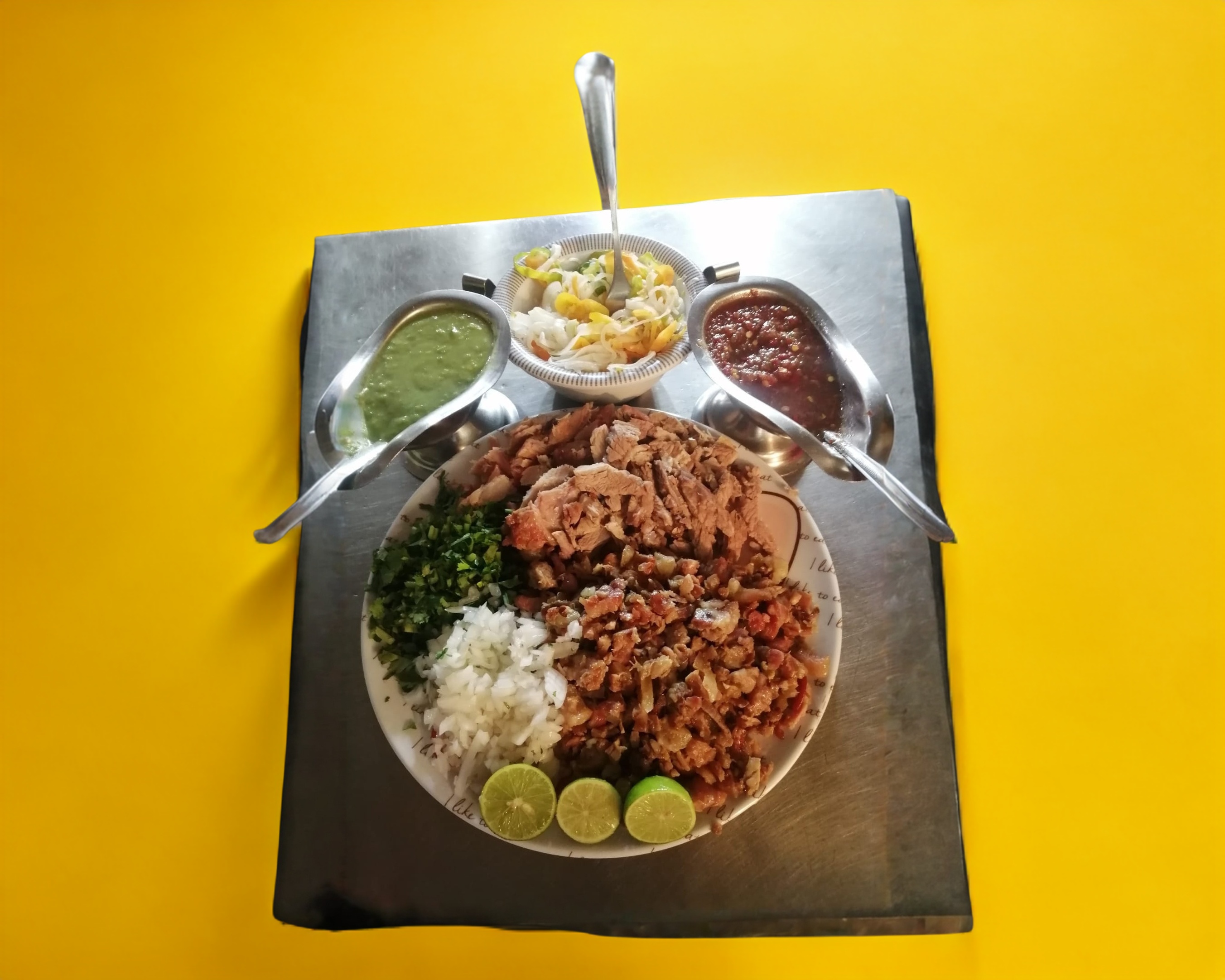 Salsa verde o roja, limones, verdura.