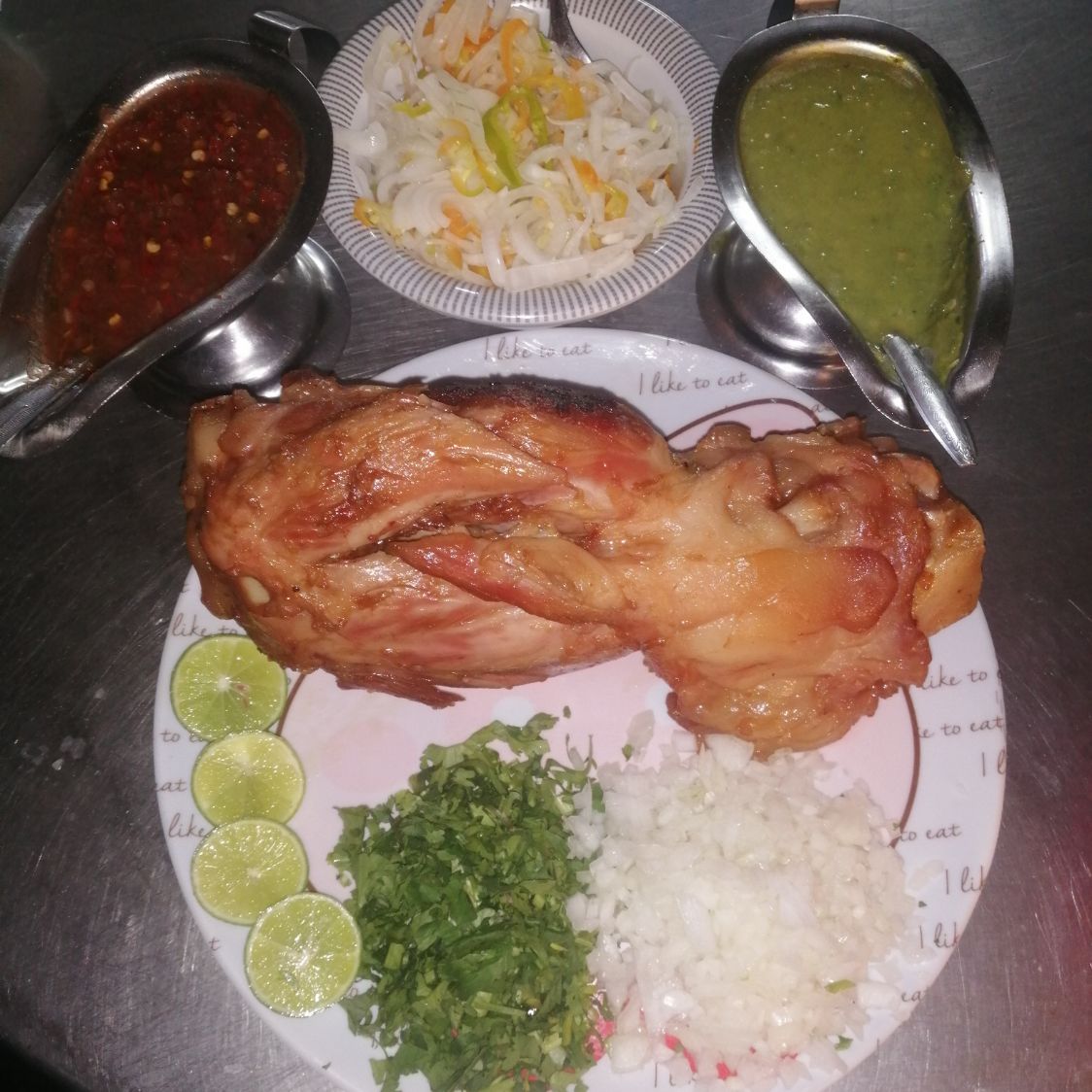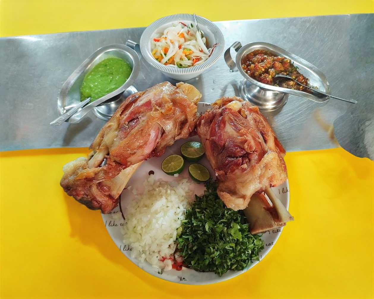 2 Chamorros grandes,Salsa verde, salsa roja, verdura y limones.