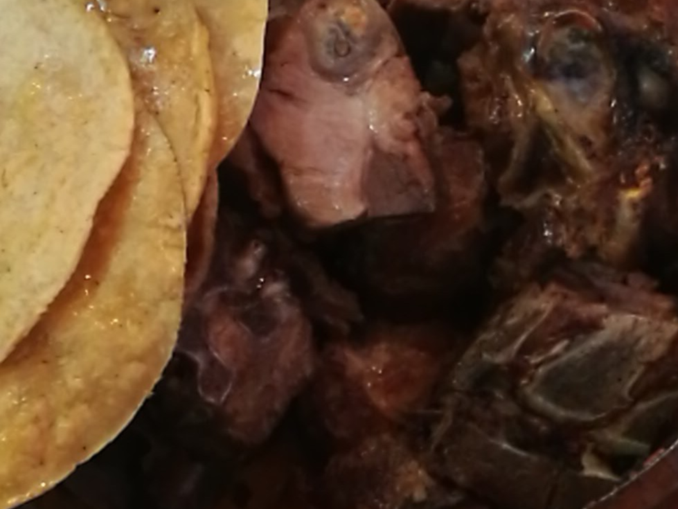 Hueso de cabeza de lomo (puerco) cocinado en manteca y acompañado de cebolla, cilantro, limón, salsa roja y tortillas (1 pieza).