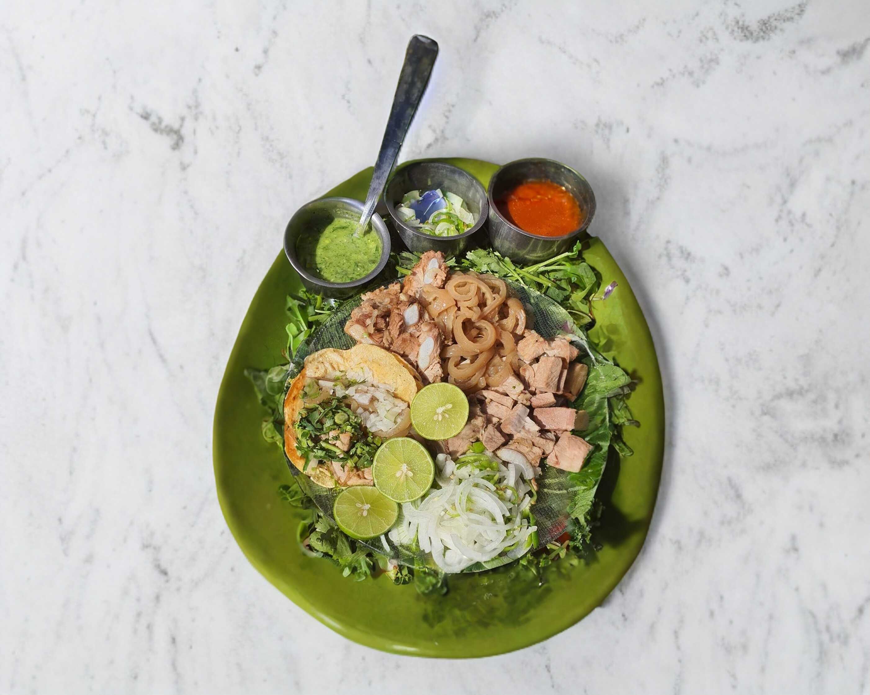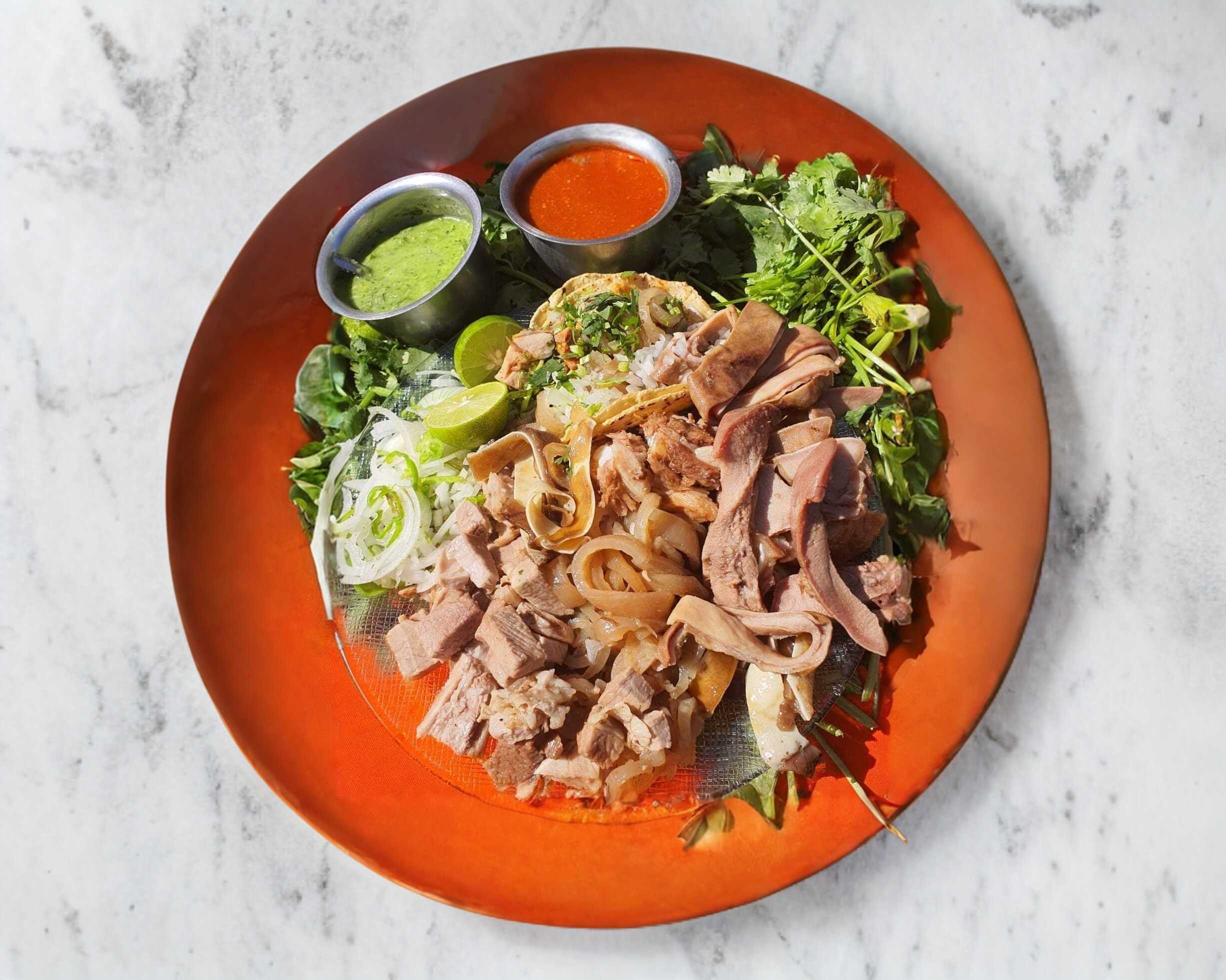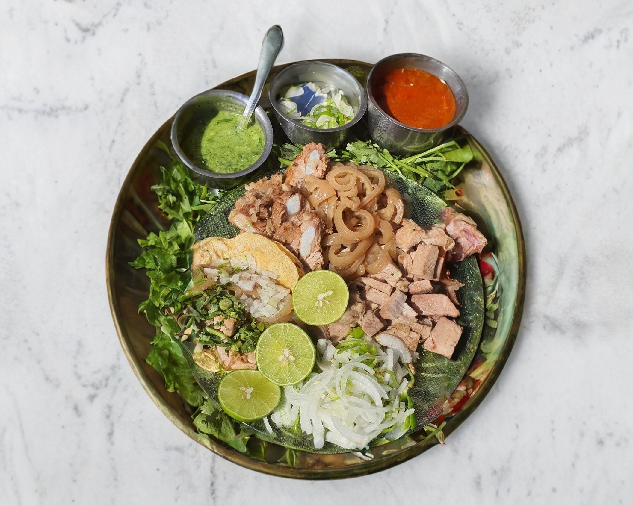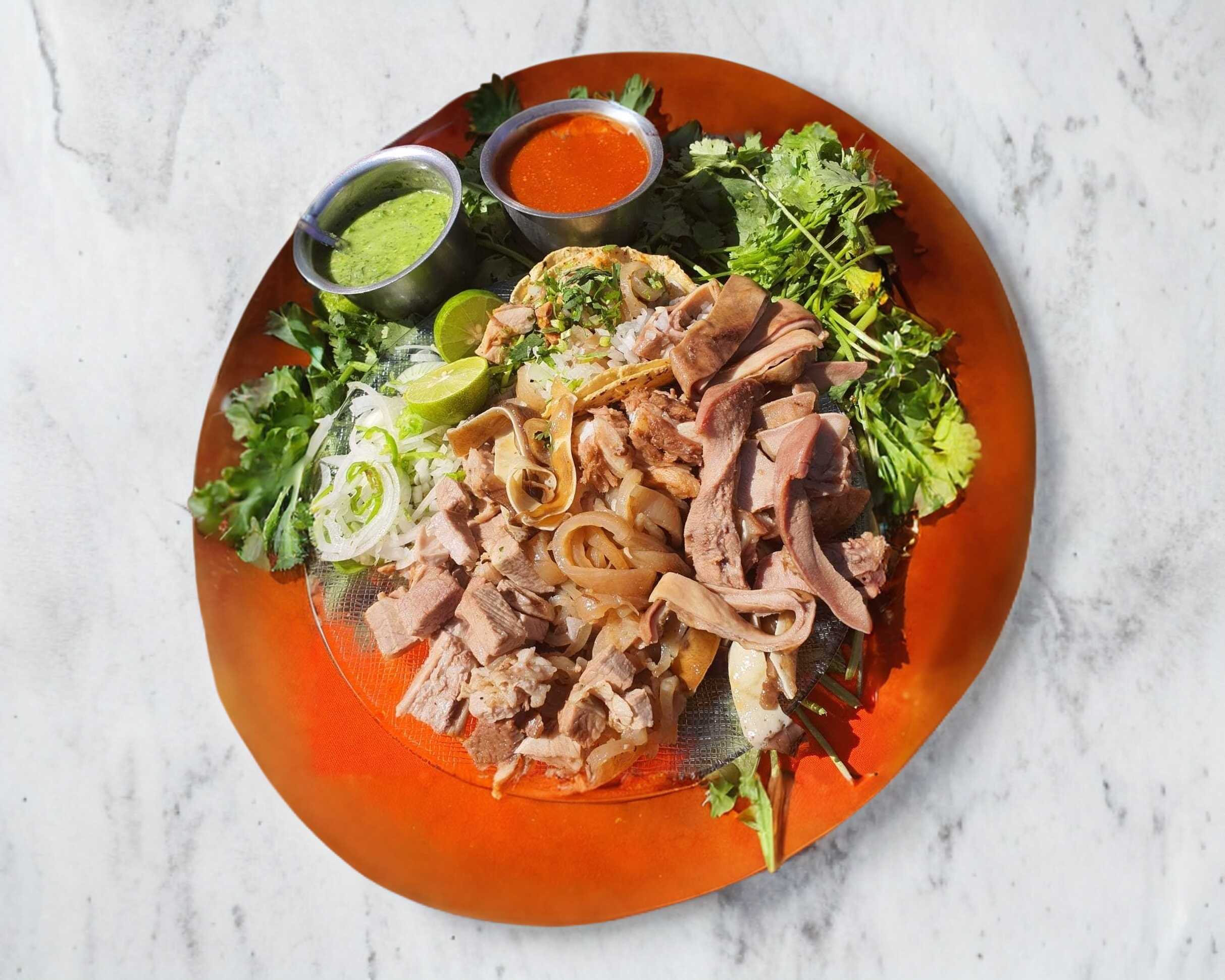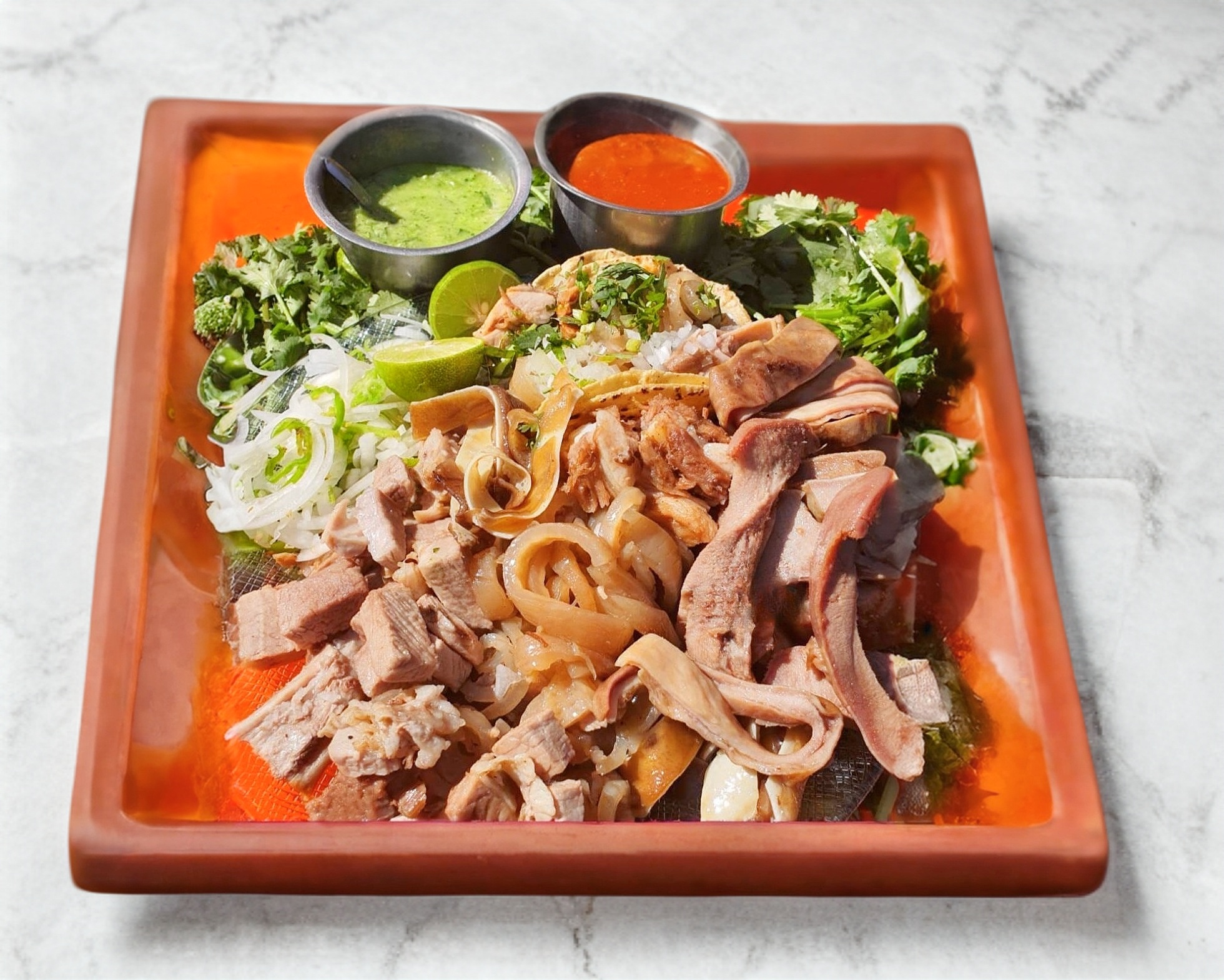 Chamorro acompañado de cilantro, cebolla, rajas de habanero, salsas verde, roja, tortillas y limones.