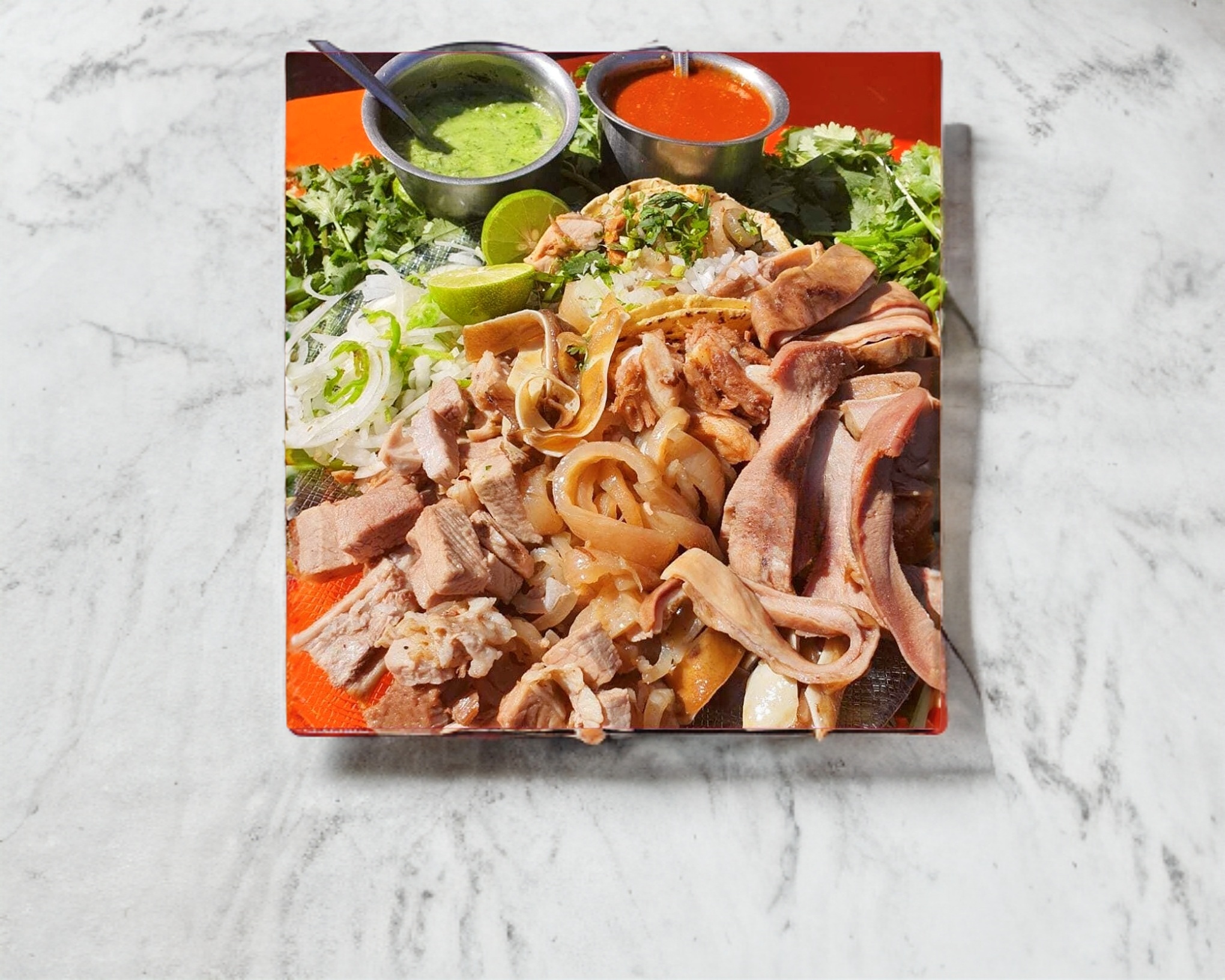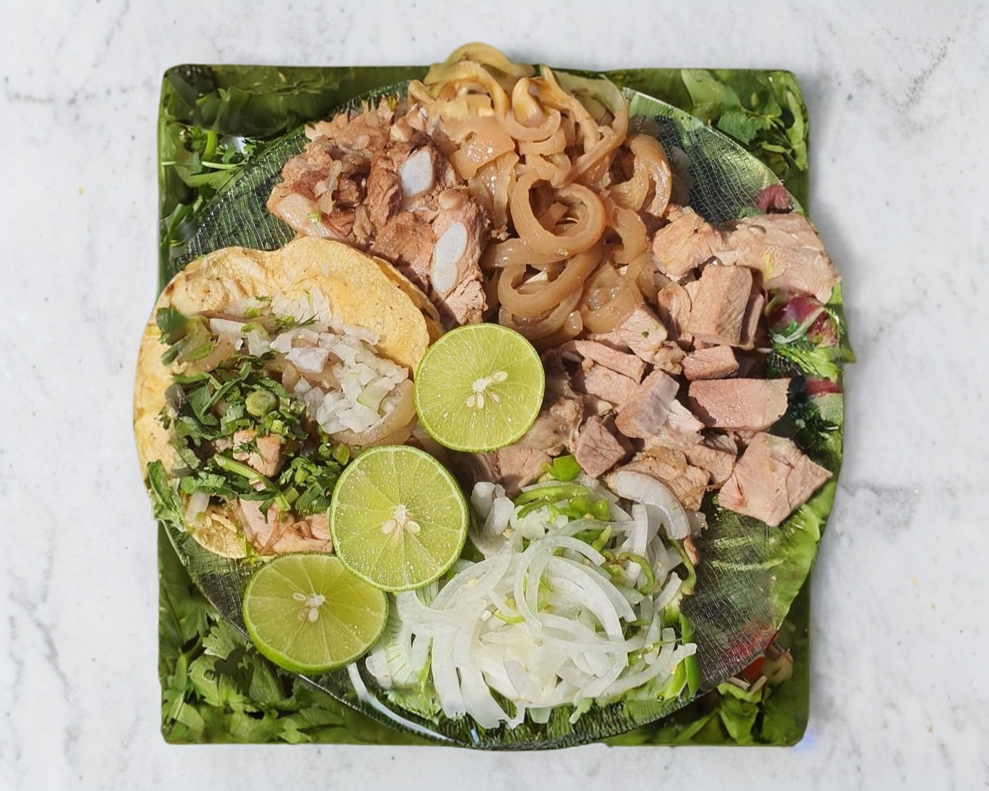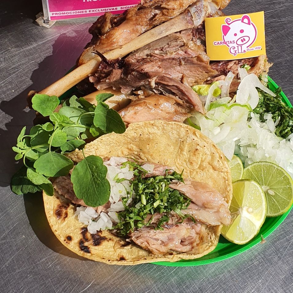 Exquisitas carnitas acompañadas de cilantro, cebolla, limones, salsa verde, salsa roja y rajas de chiles habaneros.