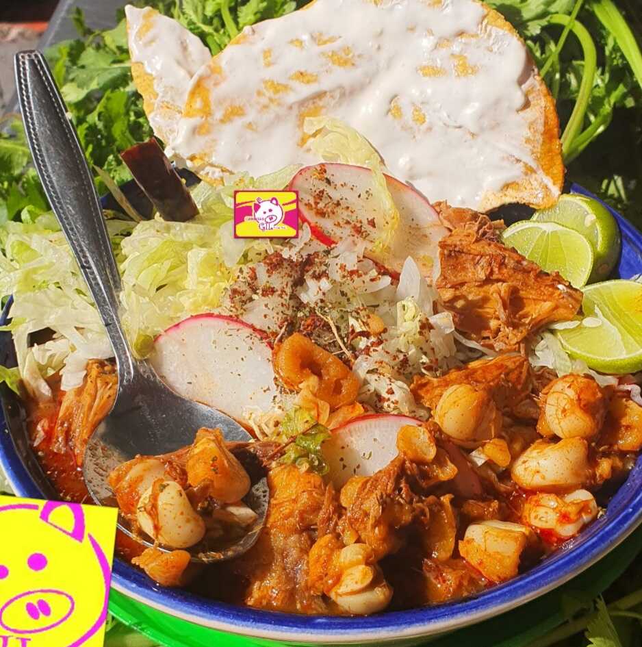 Exquisito pozole rojo ( contenedor de 32 onzas) acompañado de 4 tostadas, lechuga, rábanos, cebolla, limon, oregano y chile piquin. los complementos se envían por separado.