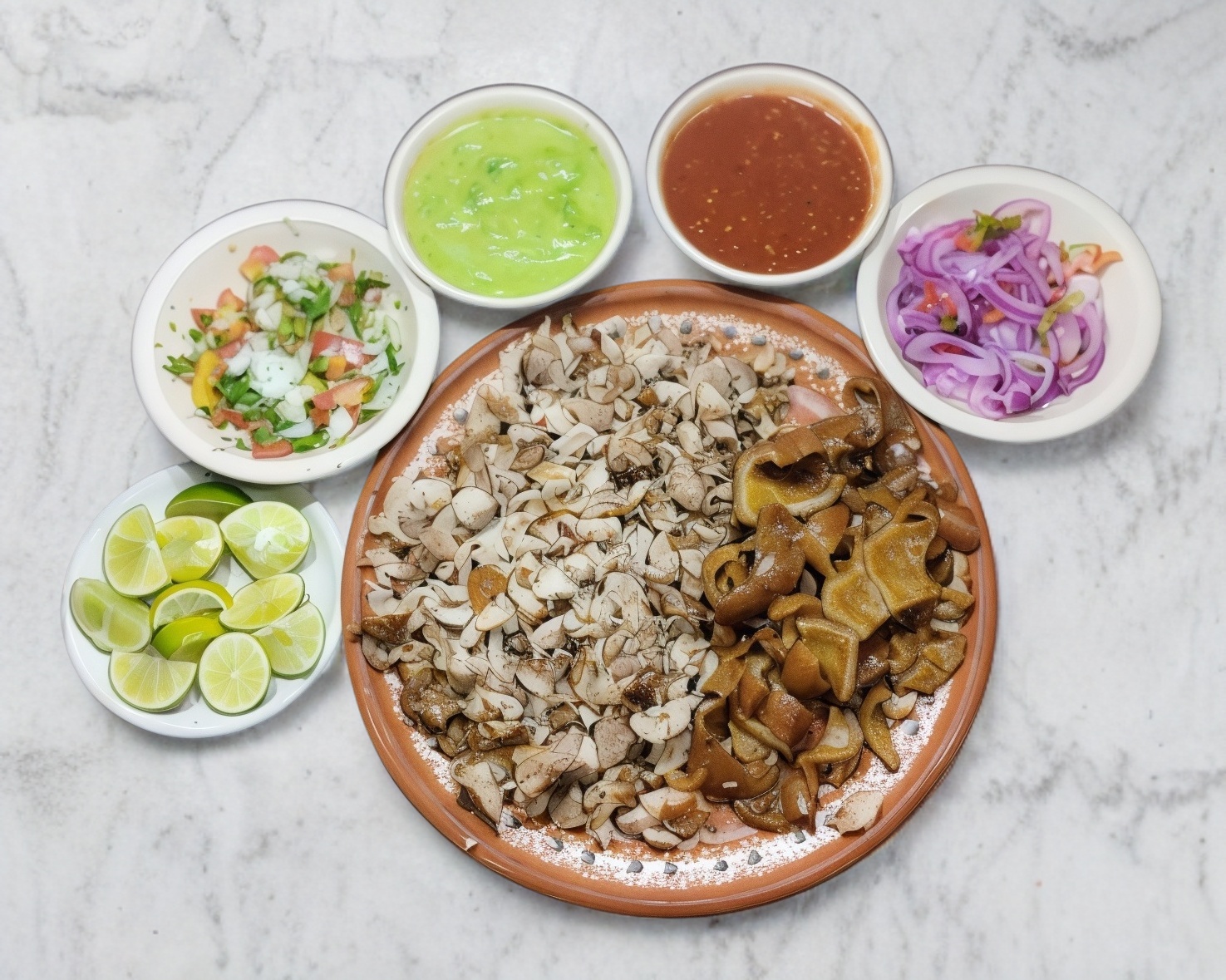 Un delicioso kilo de carnitas, incluye salsa verde y roja, pico de gallo, limones, cebollas con rajas