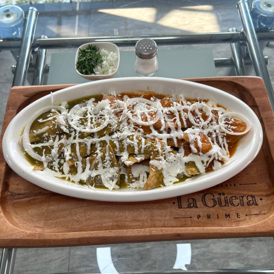Delicisiosa orden de chilaquiles, incluye fruta, cafe o agua de tamaarindo
