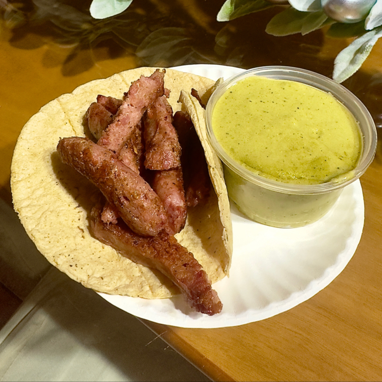 Taco de chorizo argentino dorado al punto perfecto, servido en tortilla de maíz y acompañado de nuestra salsa de la casa super cremosa. Sabor intenso, jugoso y lleno de carácter.