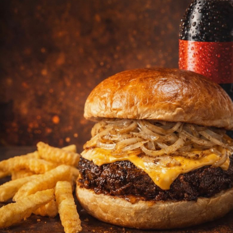 Pan brioche suave, untado con salsa bbq de la casa. Carne de sillón ahumada lentamente y bañada en BBQ, acompañada de tocino bien dorado y cebolla asada. Lleva doble rebanada de queso americano fundido que amarra con todo. Sabor intenso, ahumado y perfectamente balanceado