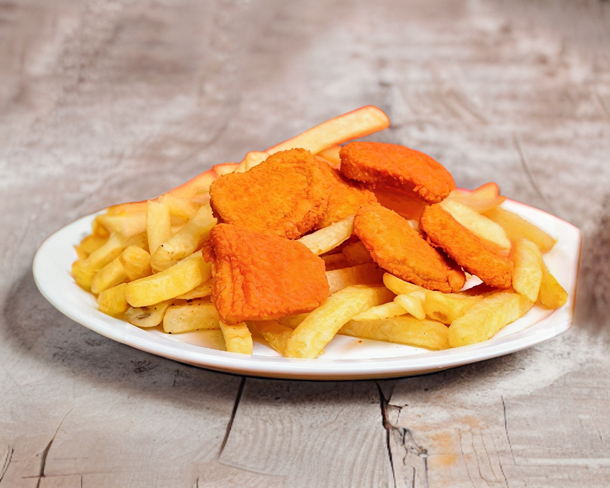 Combinando papas fritas con nugets de pollo.