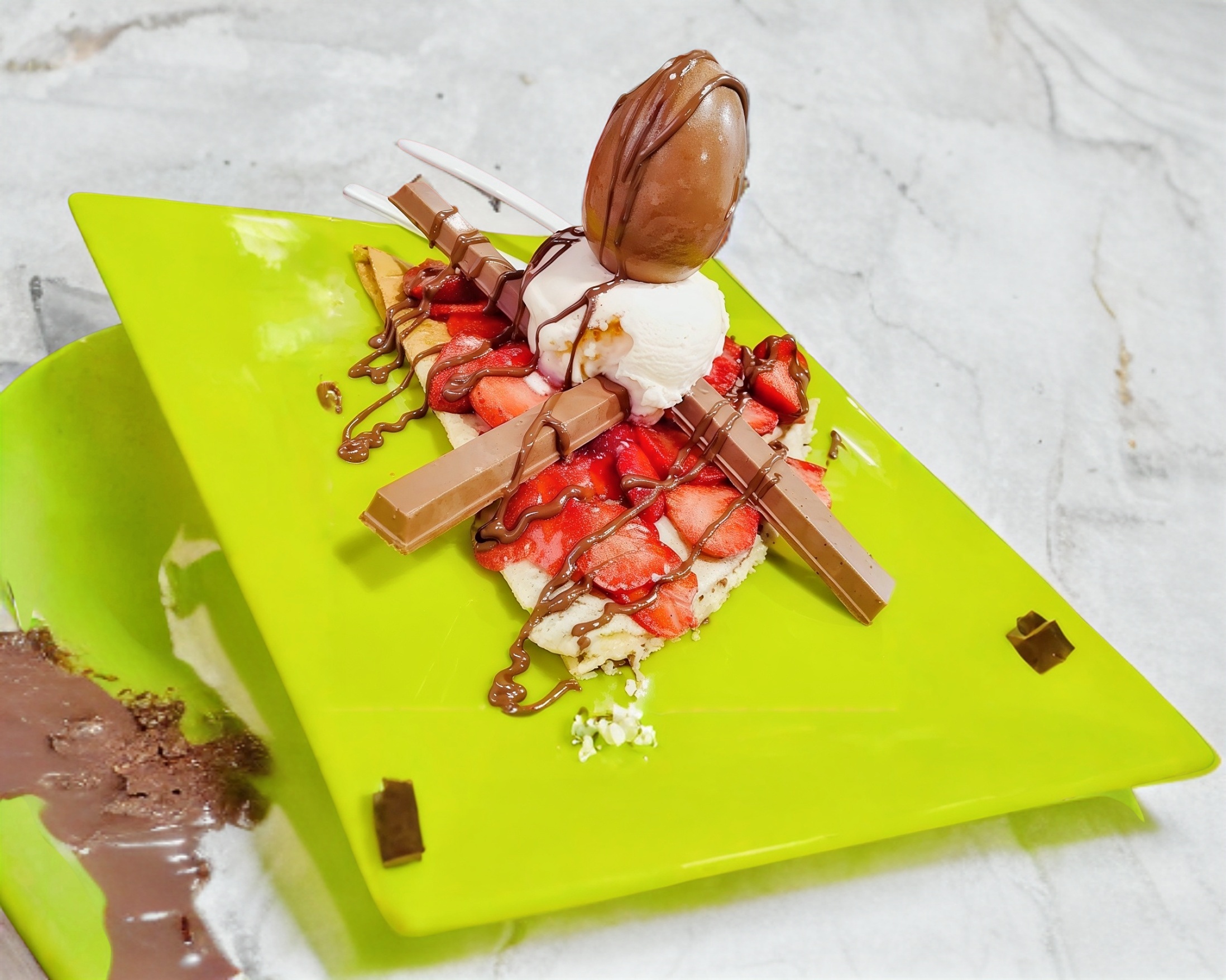 Crepa rellena de nutella, fresas rebanadas, huevito kinder sorpresa, barra de chocolate kit kat, lechera y helado para coronar.
