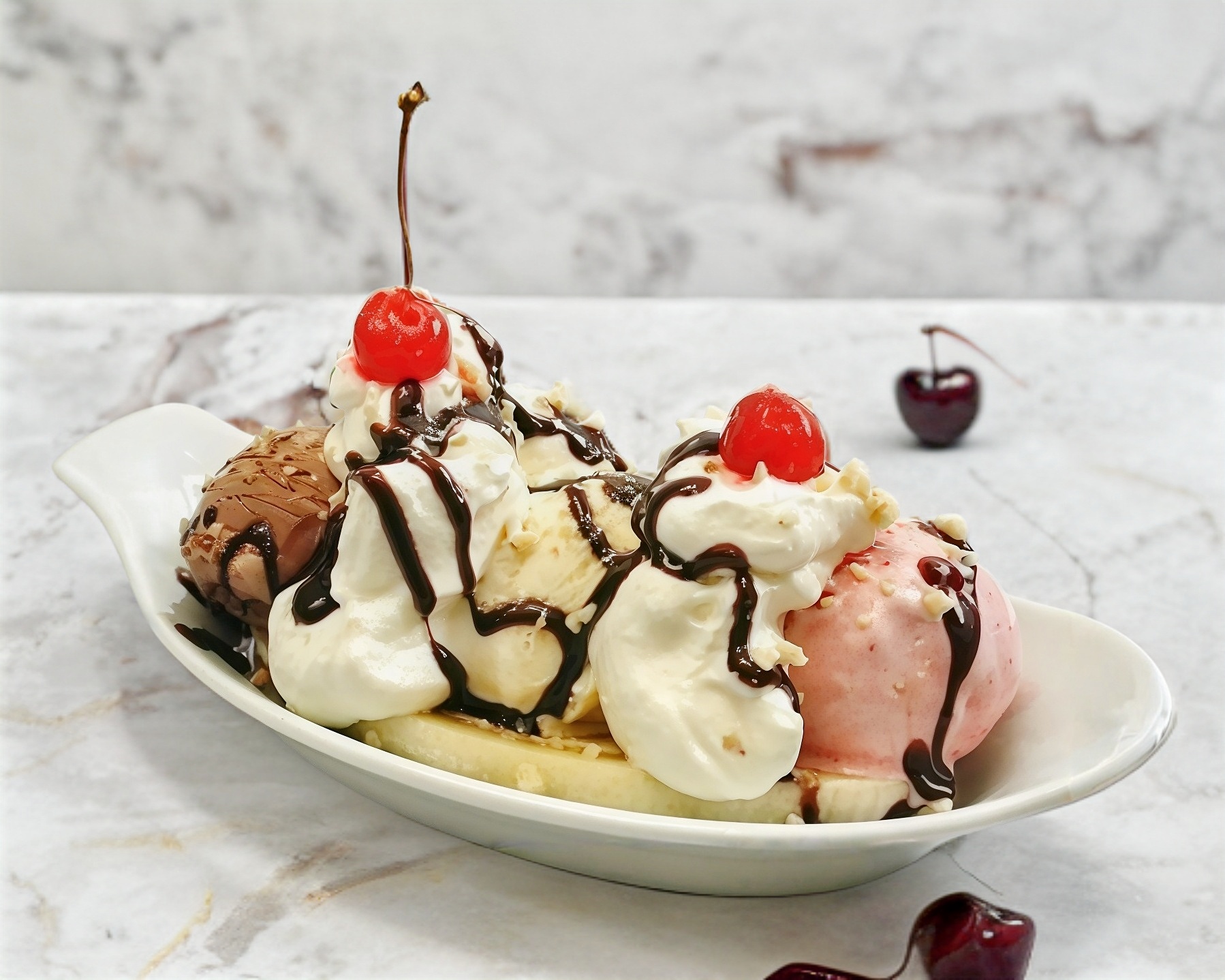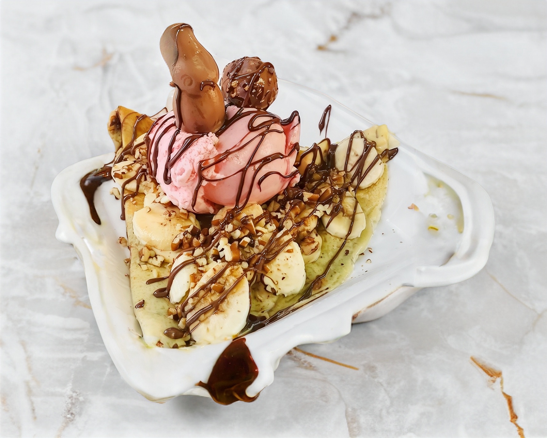 Nutella, plátano, helado, fresas y nuez.