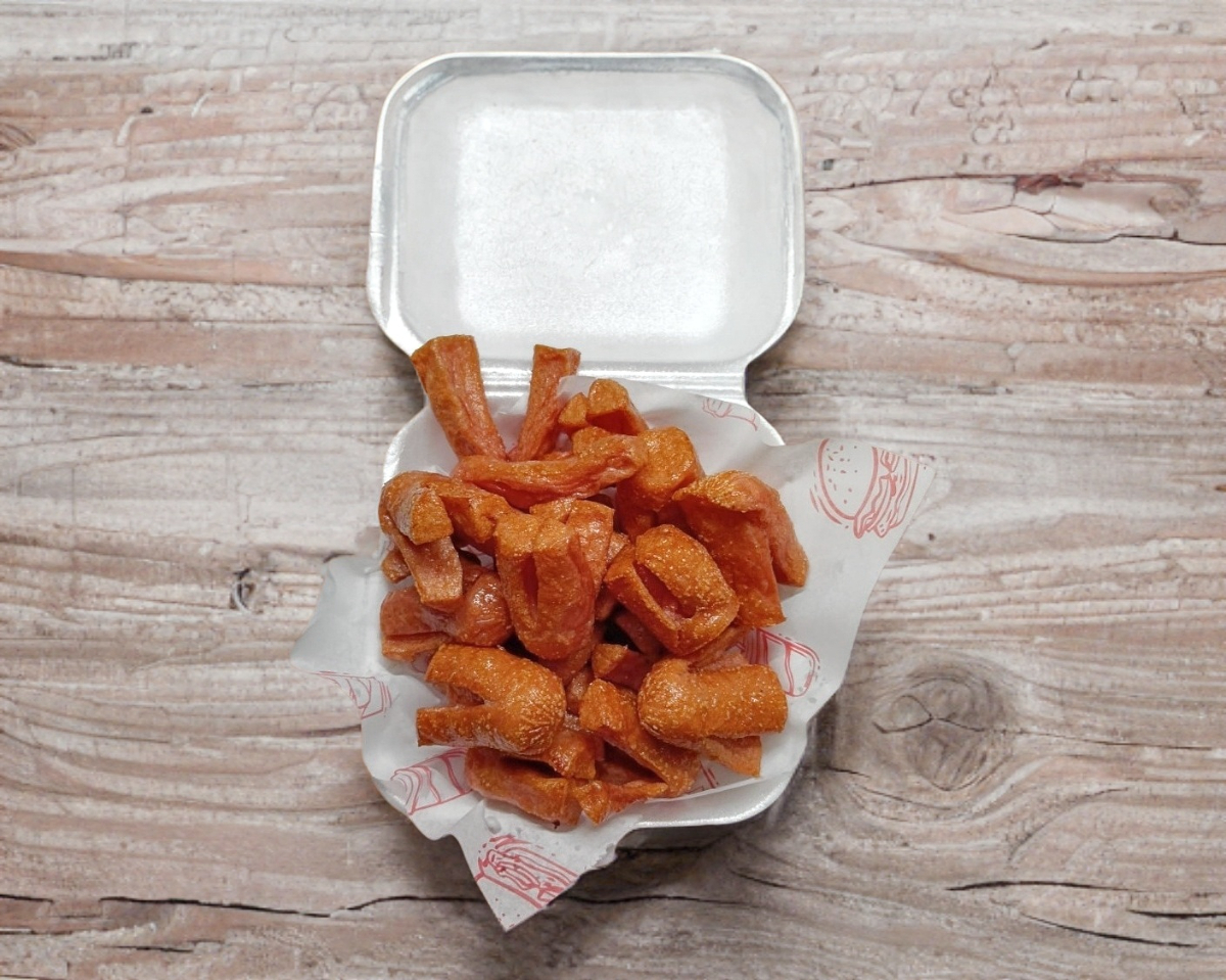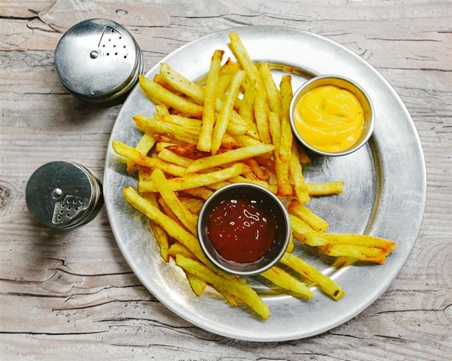 220gr de porción en Papas fritas naturales sazonadas con sal fina y acompañadas con salchipulpos. para una persona