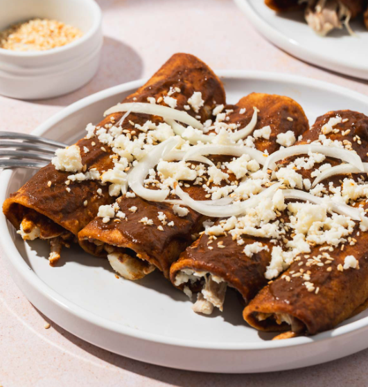 3 Piezas de enchiladas bañadas en mole.