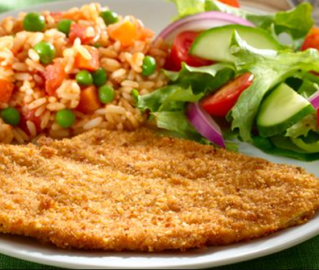 1 Pechuga empanizada acompañada de arroz, frijol, ensalada, salsa y tortillas.