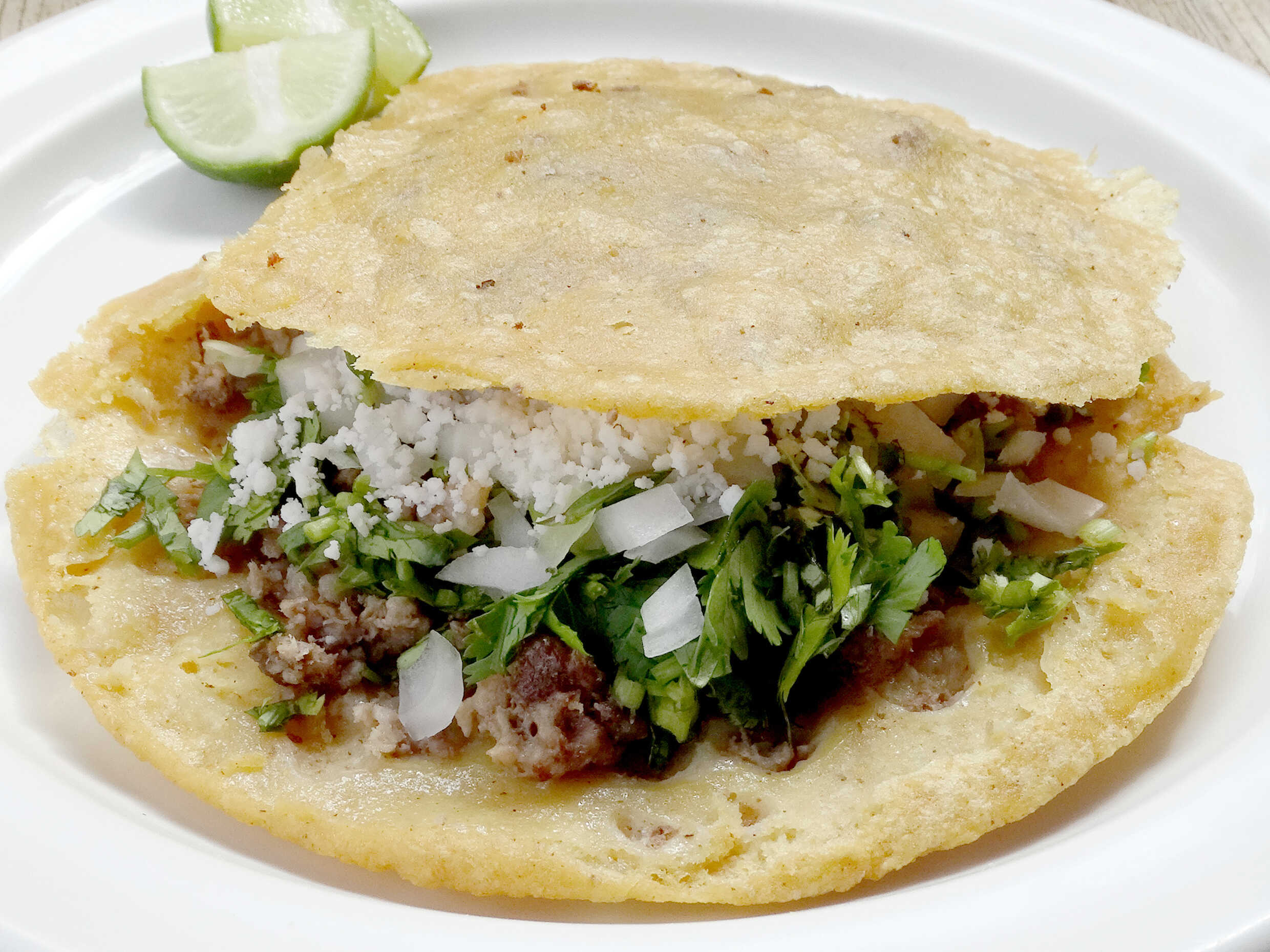 Tortilla de maíz doblada con chicharrón prensado, quesillo, lechuga, crema y queso rallado