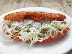 Un exquisito pambazo bañado en salsa roja, relleno de papa con longaniza o tinga de pollo, acompañado de lechuga fresca, queso rallado, crema y un toque extra de salsa para realzar su sabor. ¡Una delicia mexicana que no puedes dejar pasar!.