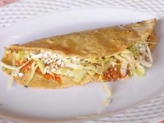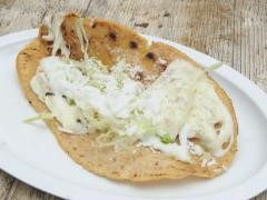 Tortilla de maíz doblada con quesillo, lechuga, crema y queso rallado