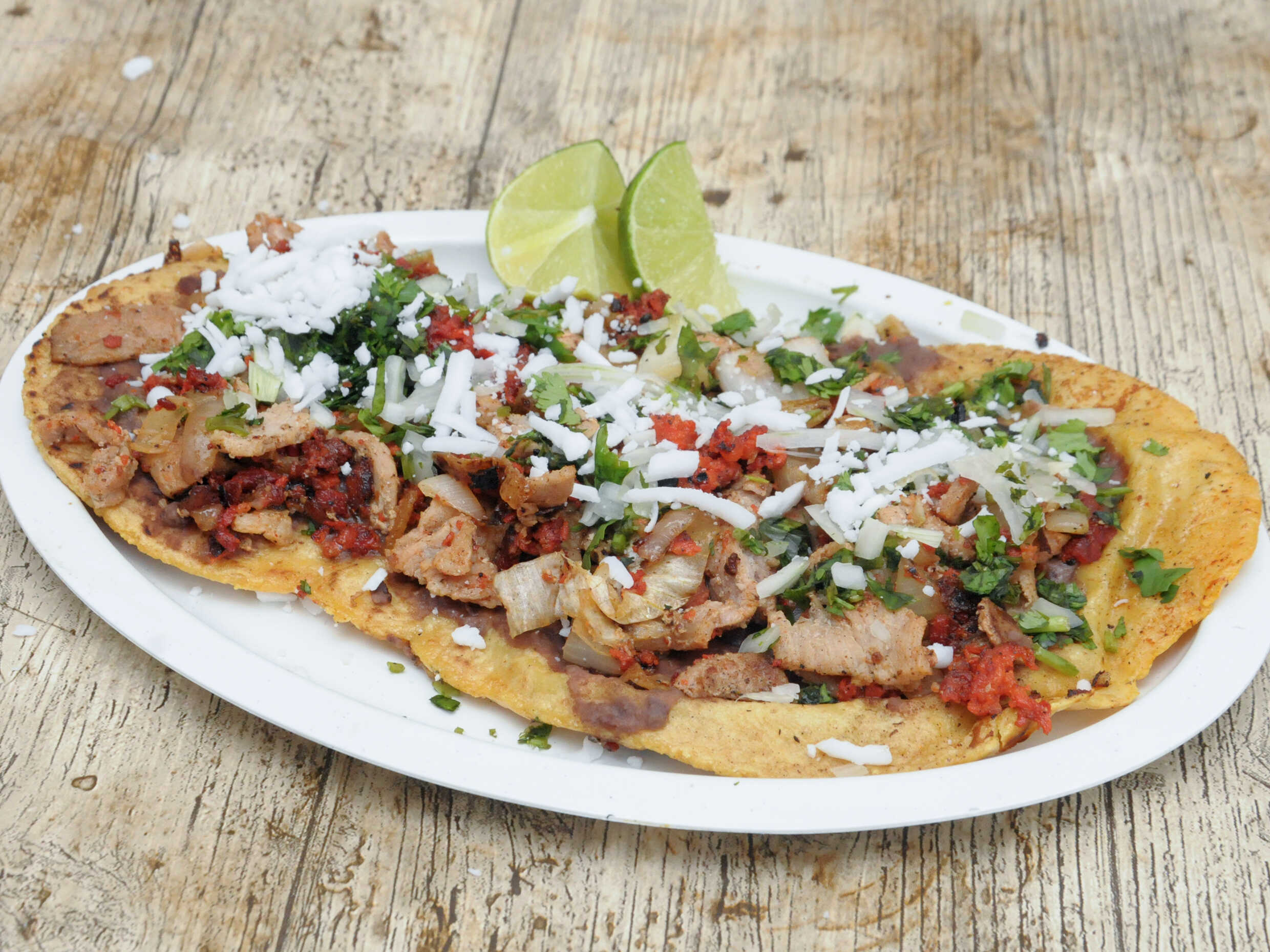 Masa de maíz dorada y rellena de chicharrón prensado, con su característico sabor y textura crujiente. Servida con lechuga fresca, crema, queso rallado y salsa al gusto. ¡Un clásico mexicano que nunca falla!😋