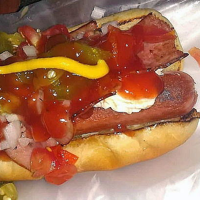 Hot dog con salchicha JUMBO, acompañado de mayonesa, catsup, jitomate, cebolla y chiles picados