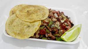 2 Tortillas 50 gramos de arrachera, papa pepinos salsa y limones.
