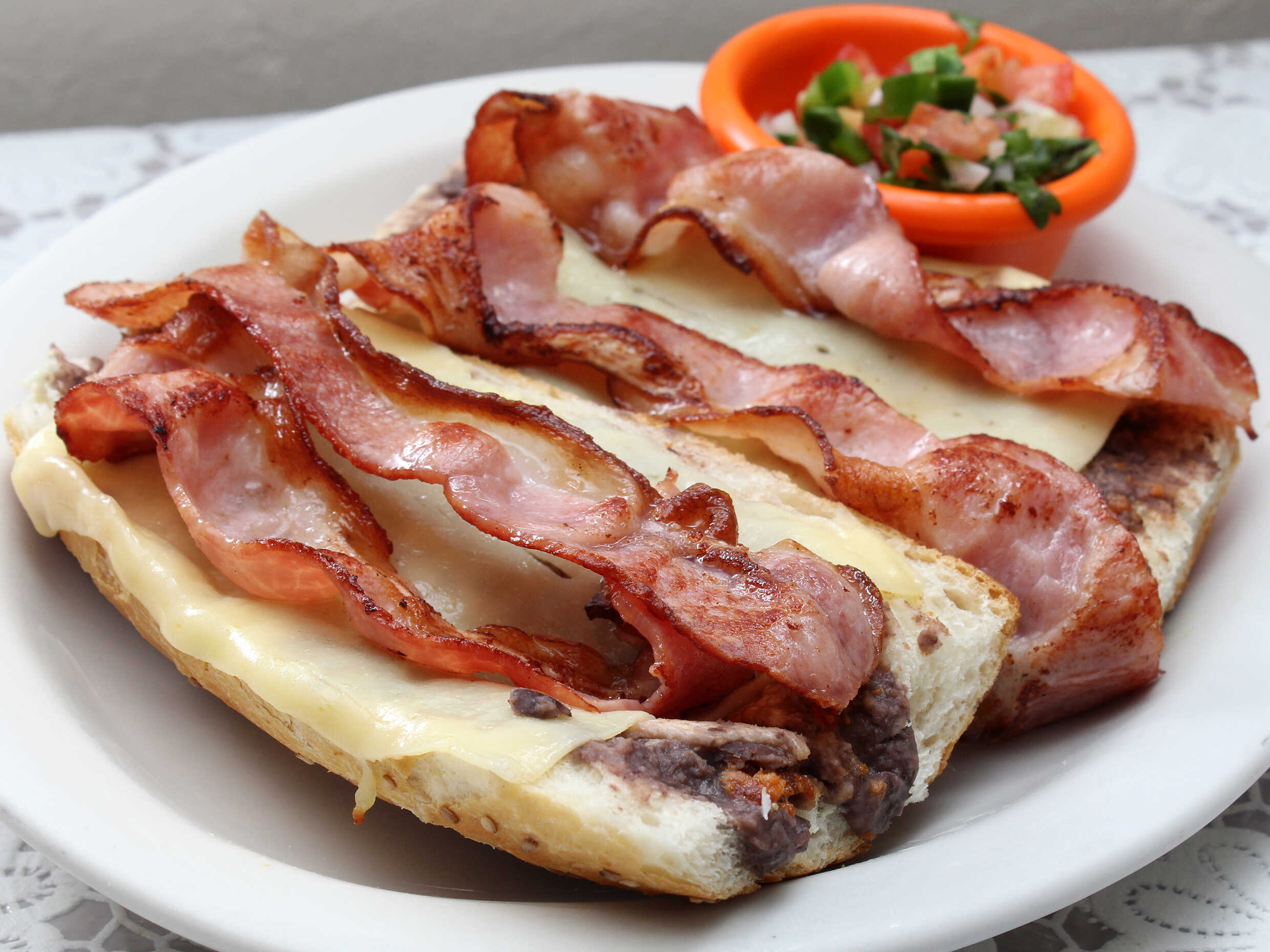 2 pz de Molletes con tocino frijoles queso manchego café de olla jugo o fruta.