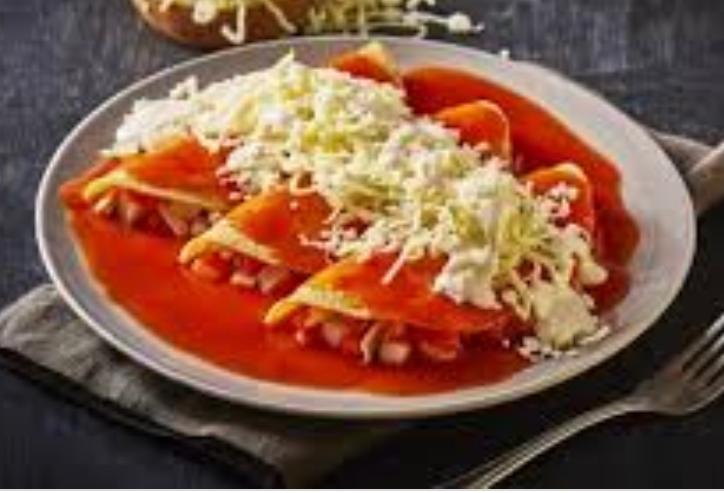 3 Pz de Enchiladas rellenas de pechuga de pollo queso, crema, pan, café de olla jugo o fruta.