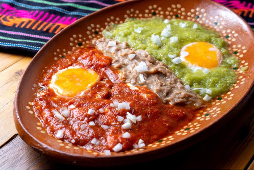 Huevos divorciados salsa roja y verde con tortilla frita café de olla jugo o fruta.