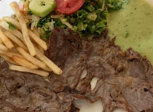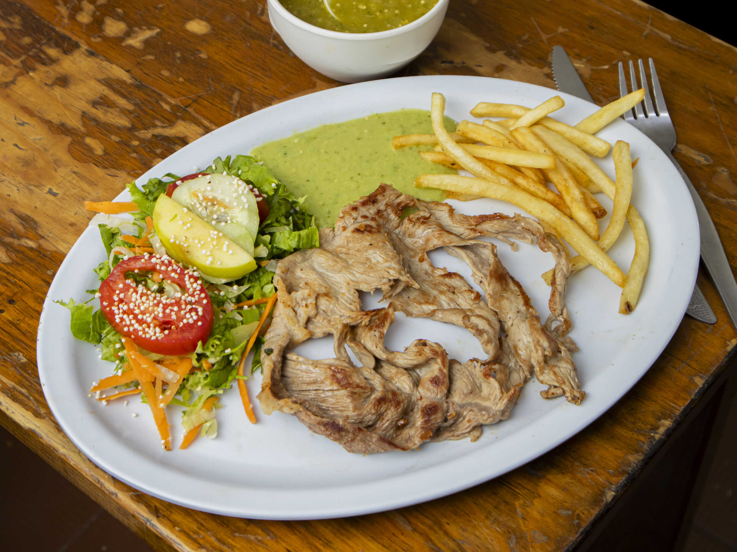Cecina de yecapixtla acompañada de ensalada verde, papas a la francesa y guacamole.