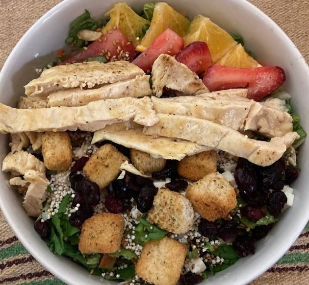 Mix de lechuga, jícama, zanahoria, jitomate, pepino, arándano, ajonjolí, amaranto, queso panela, crutones + proteína.