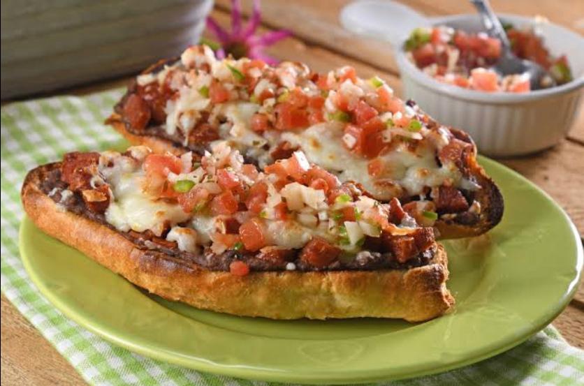 2 pz de Molletes con chorizo frijoles refritos queso manchego café de olla jugo o fruta.