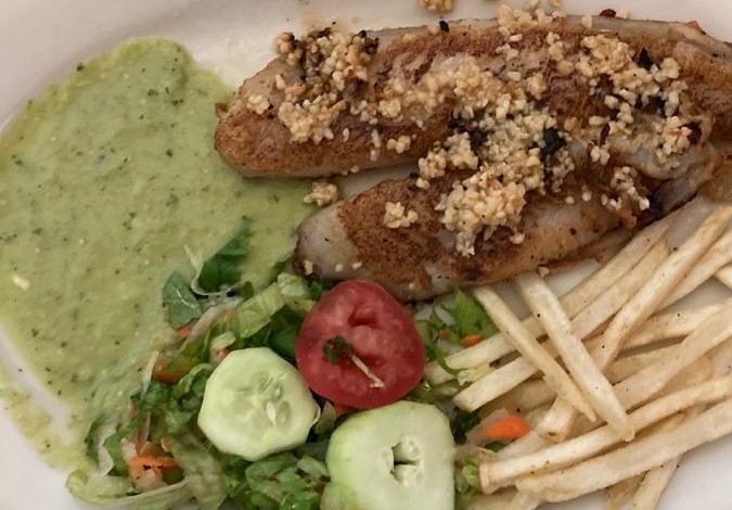 Filete de pescado al mojo de ajo ensalada verde y papas ala francesa, frijoles y guacamole.