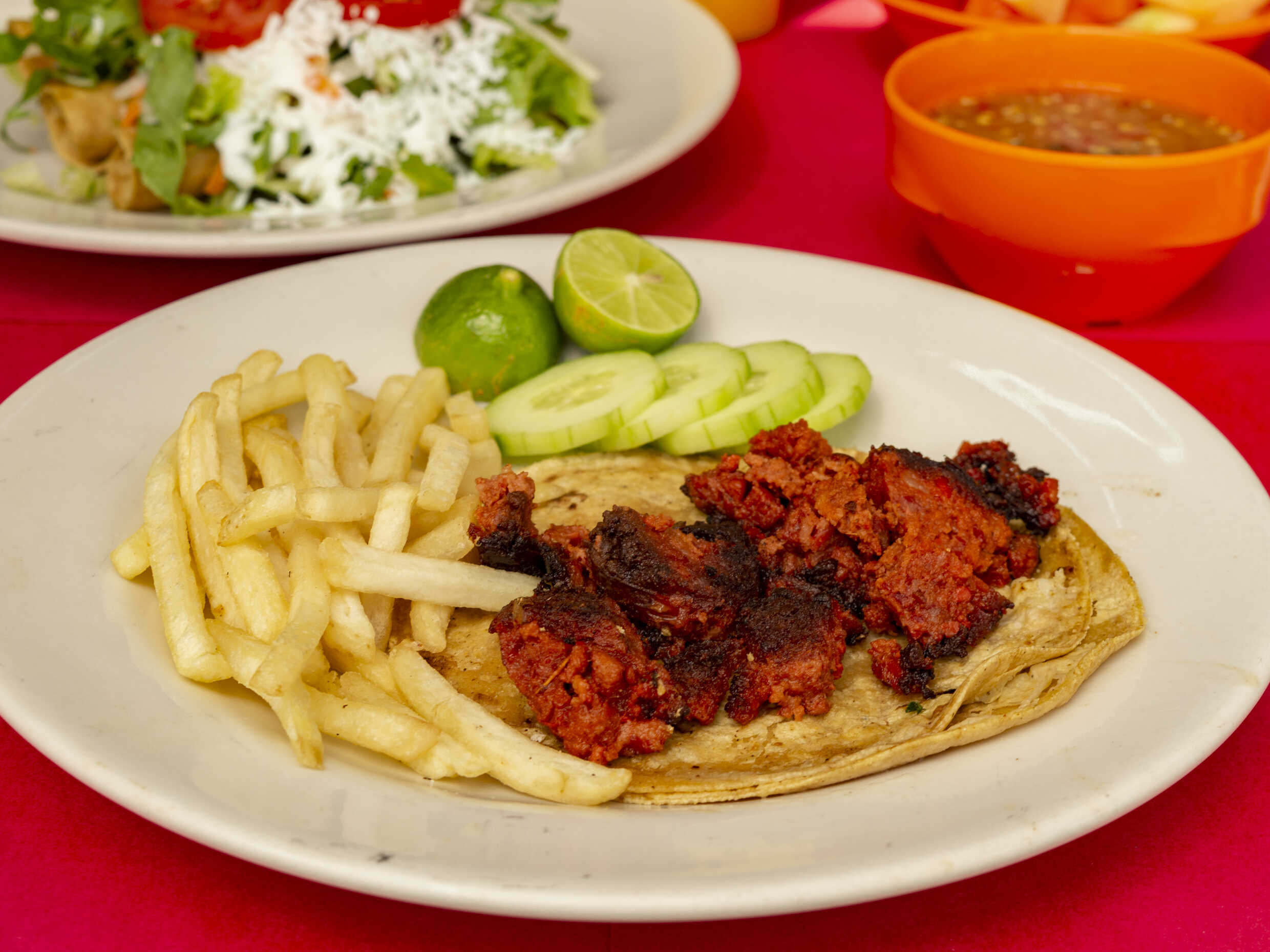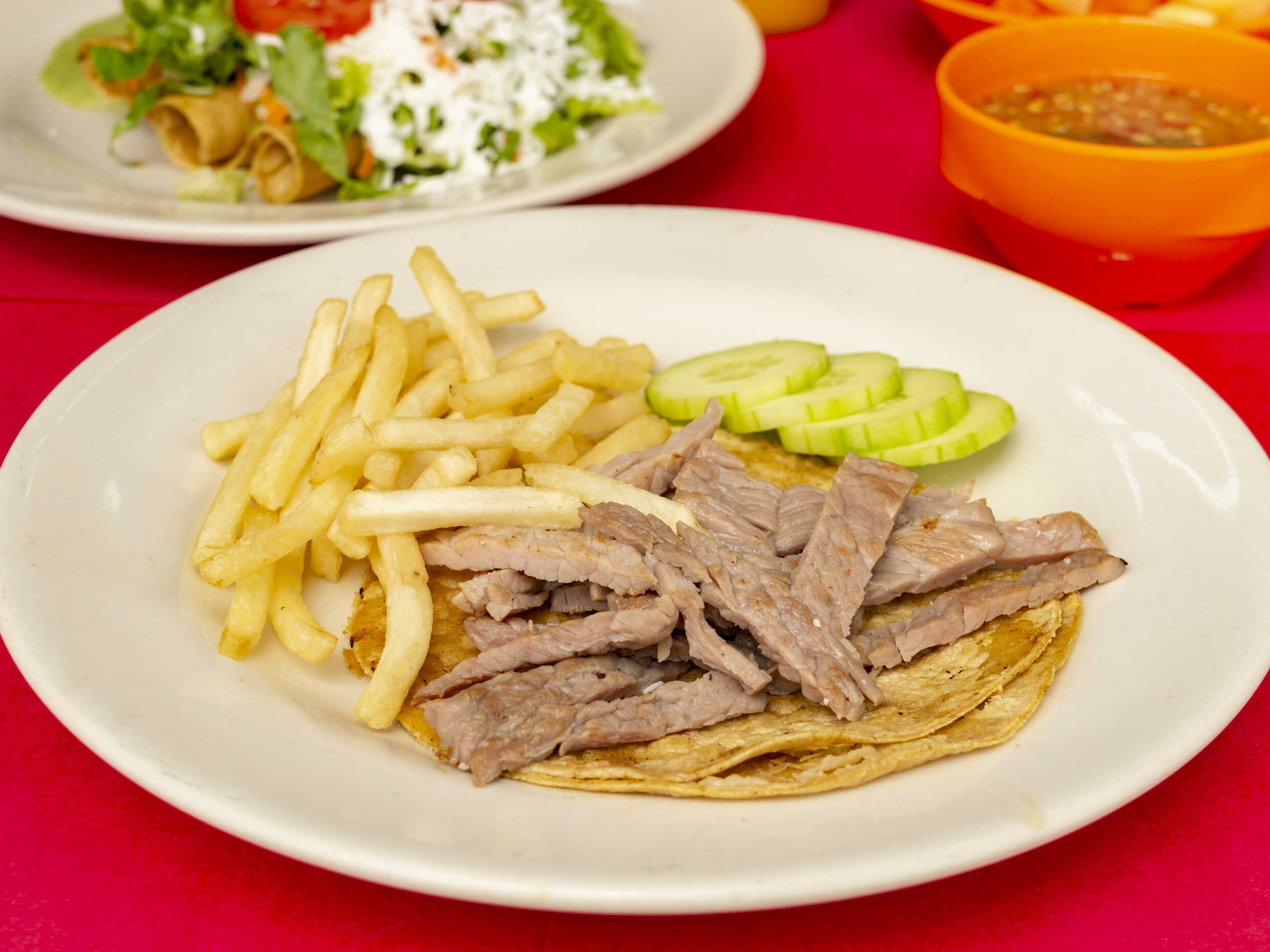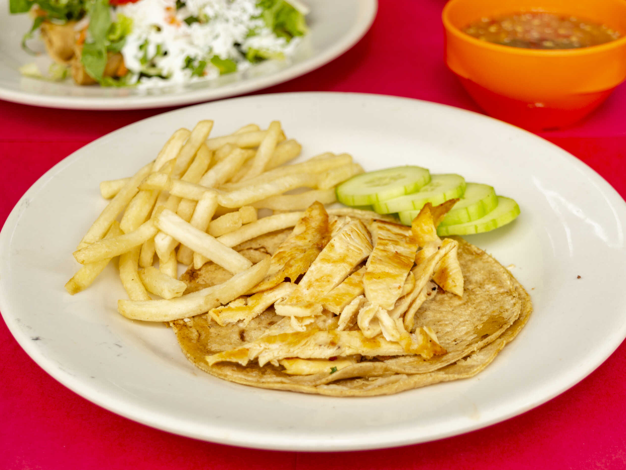 2 Tortillas con 50 gramos de pechuga de pollo acompañado de papas a la francesa y pepinos, salsa y limones. Platillo personal