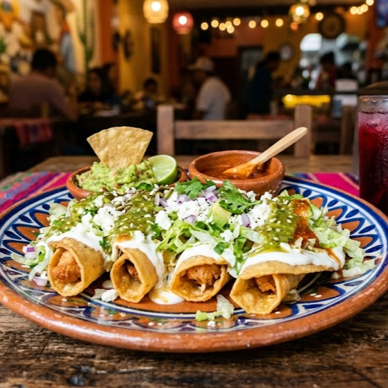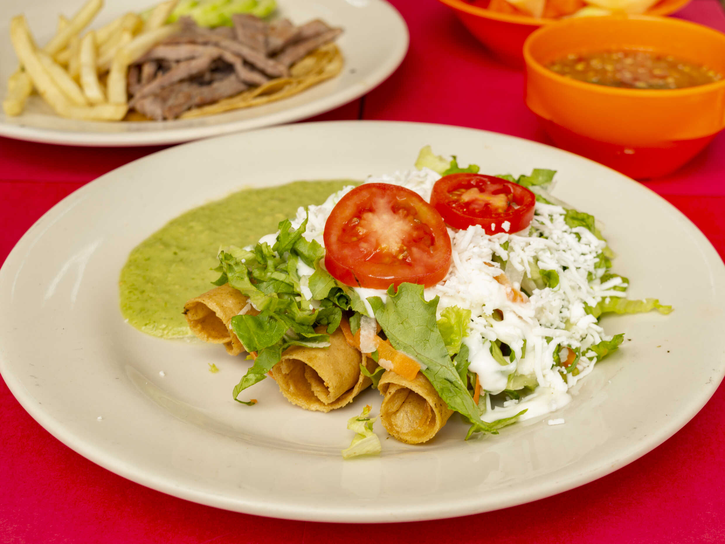 3 pz de tacos dorados acompañado de lechuga crema y queso.