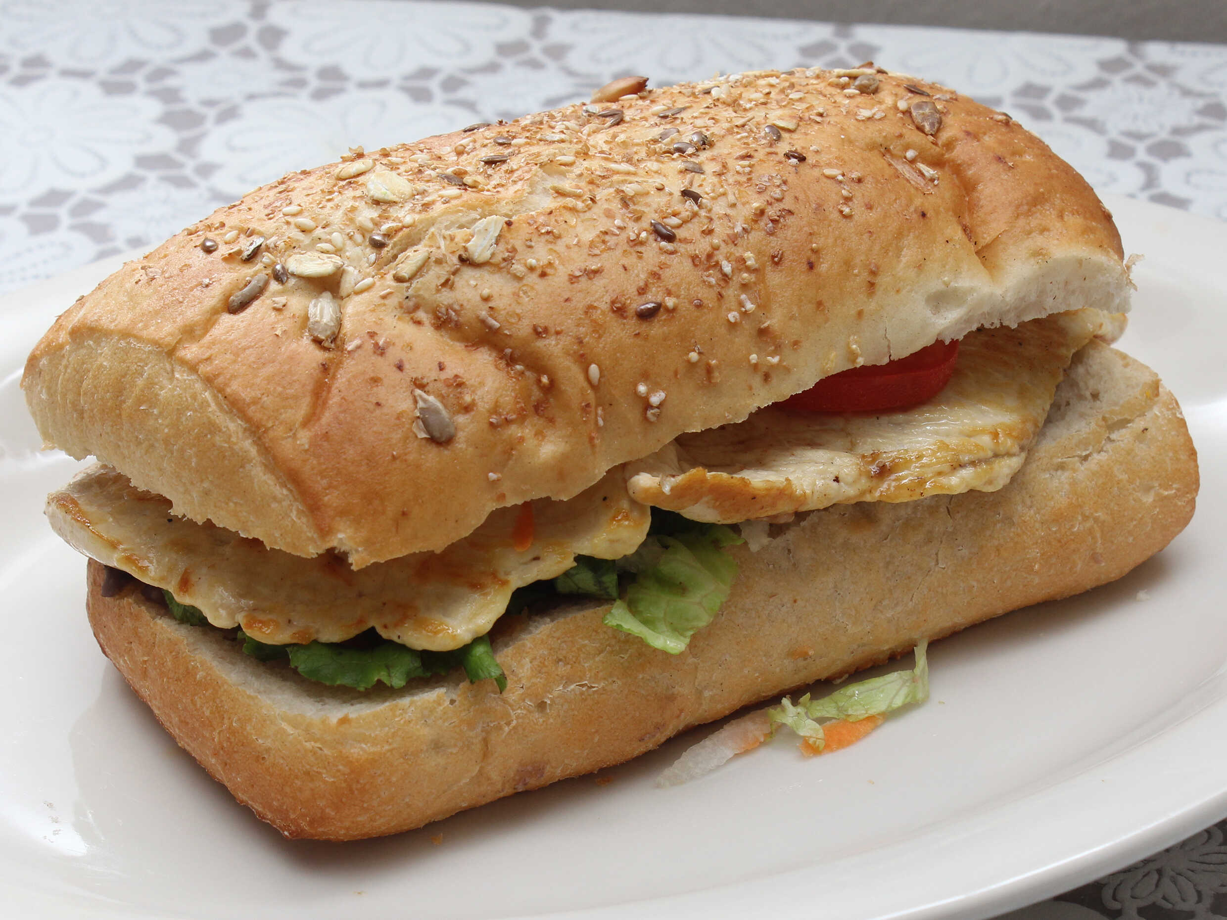 Chapata de pechuga de pollo frijoles, mayonesa, lechuga, jitomate, queso panela café de olla jugo o fruta.