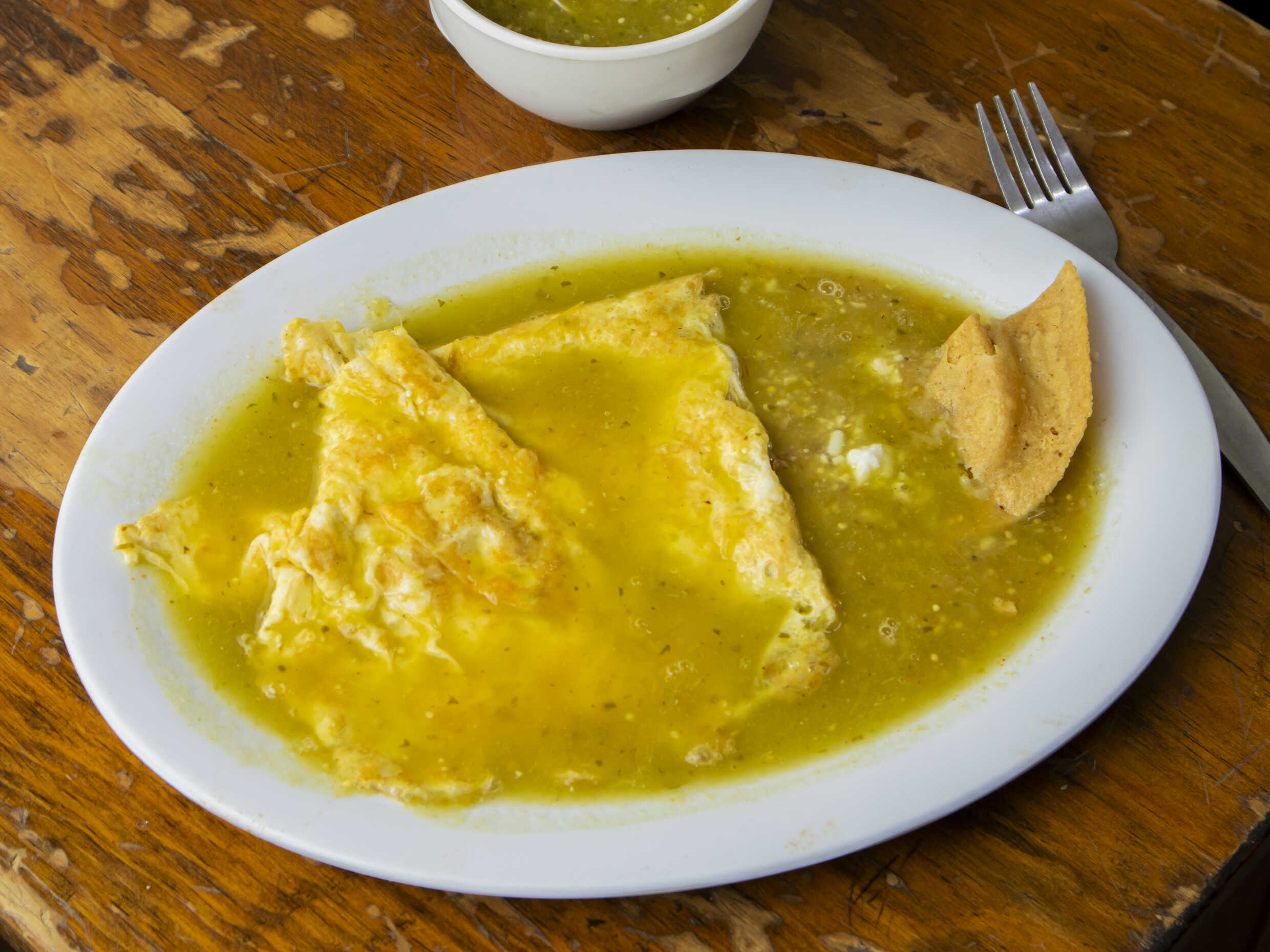 Huevos estrellados bañados en salsa verde con tortilla frita café de olla, jugo o fruta.
