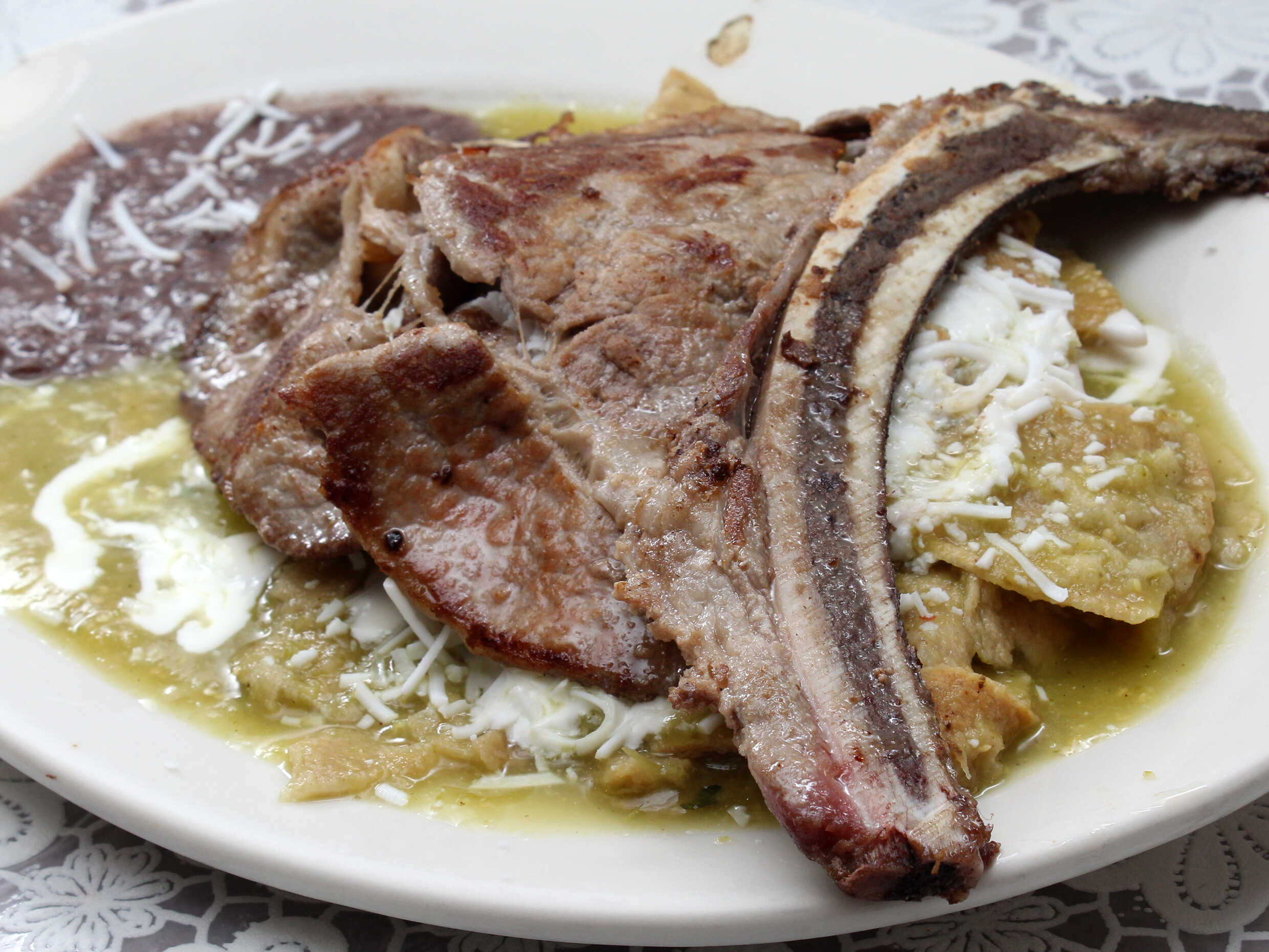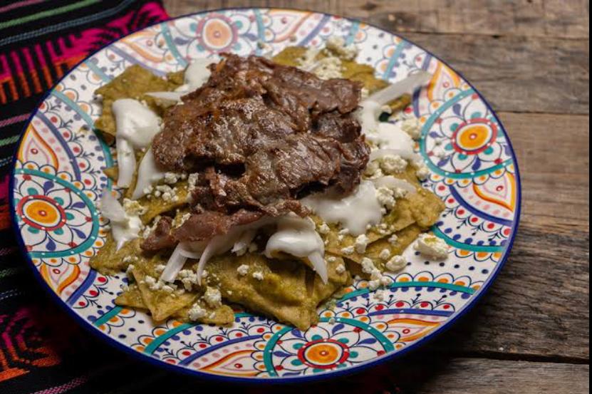 Chilaquiles con bistec de res café de olla jugo o fruta queso, crema, pan.