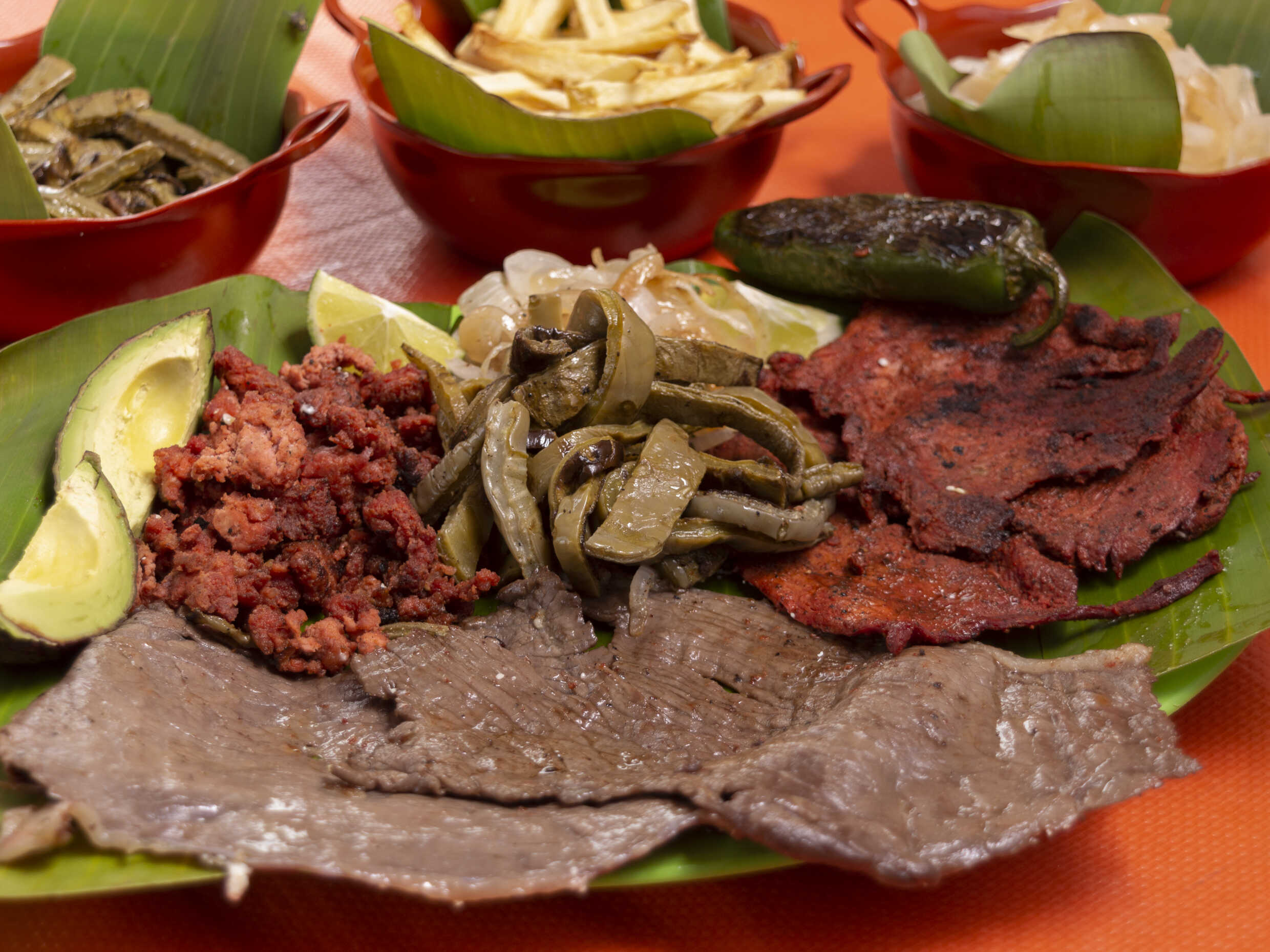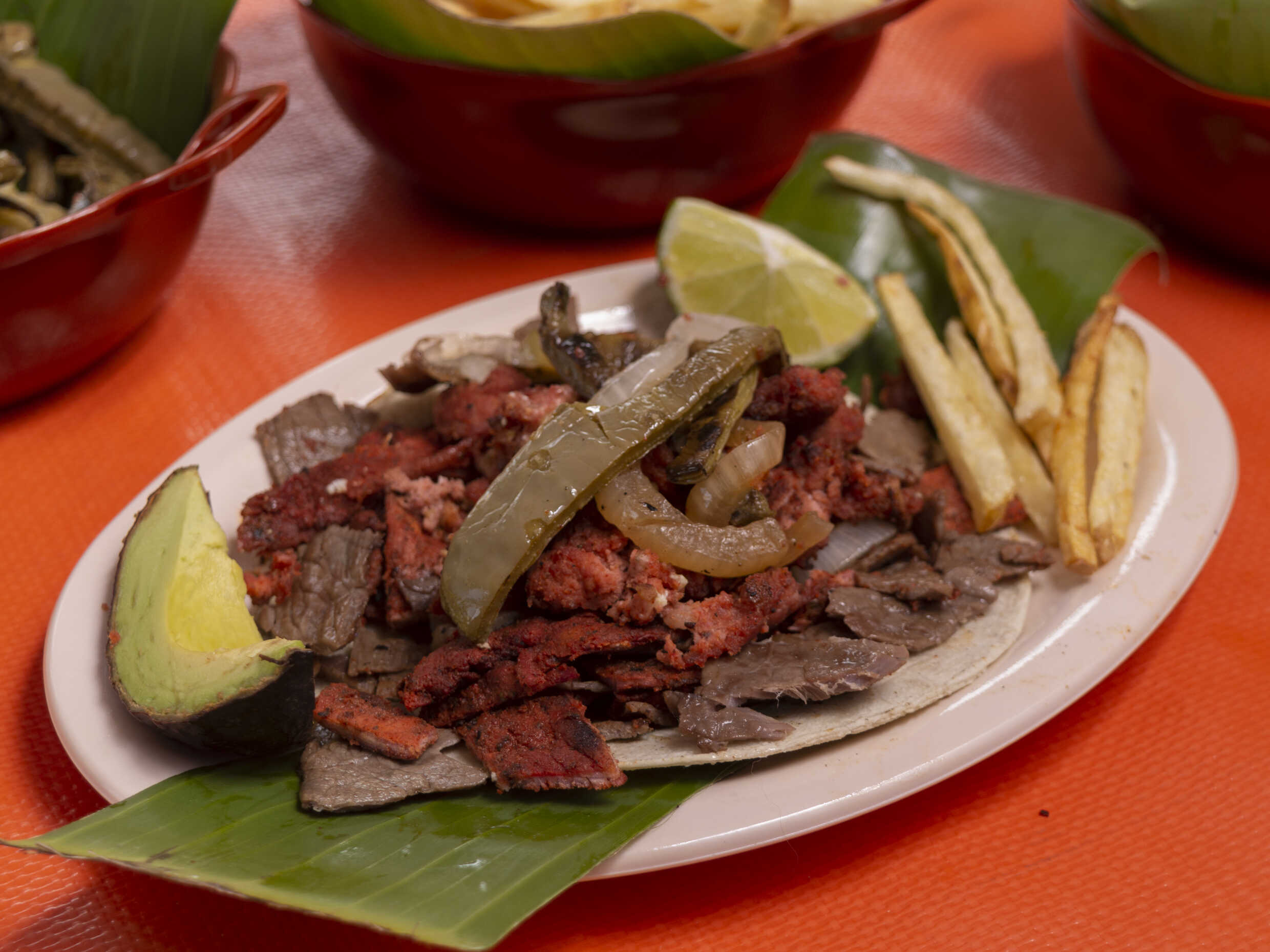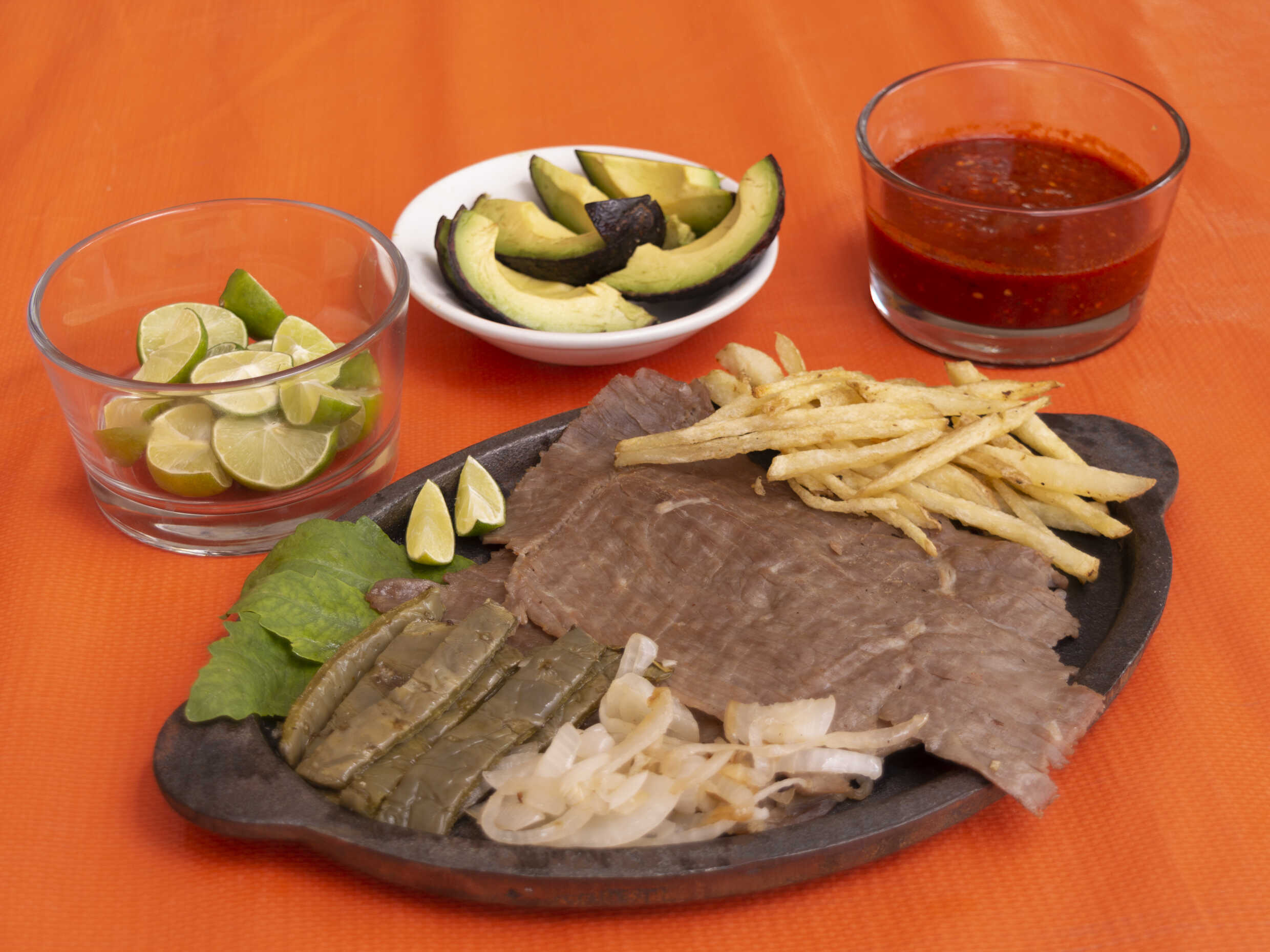1 kg. de carne a elegir, papas grandes, nopales, cebollitas, salsas y limones.