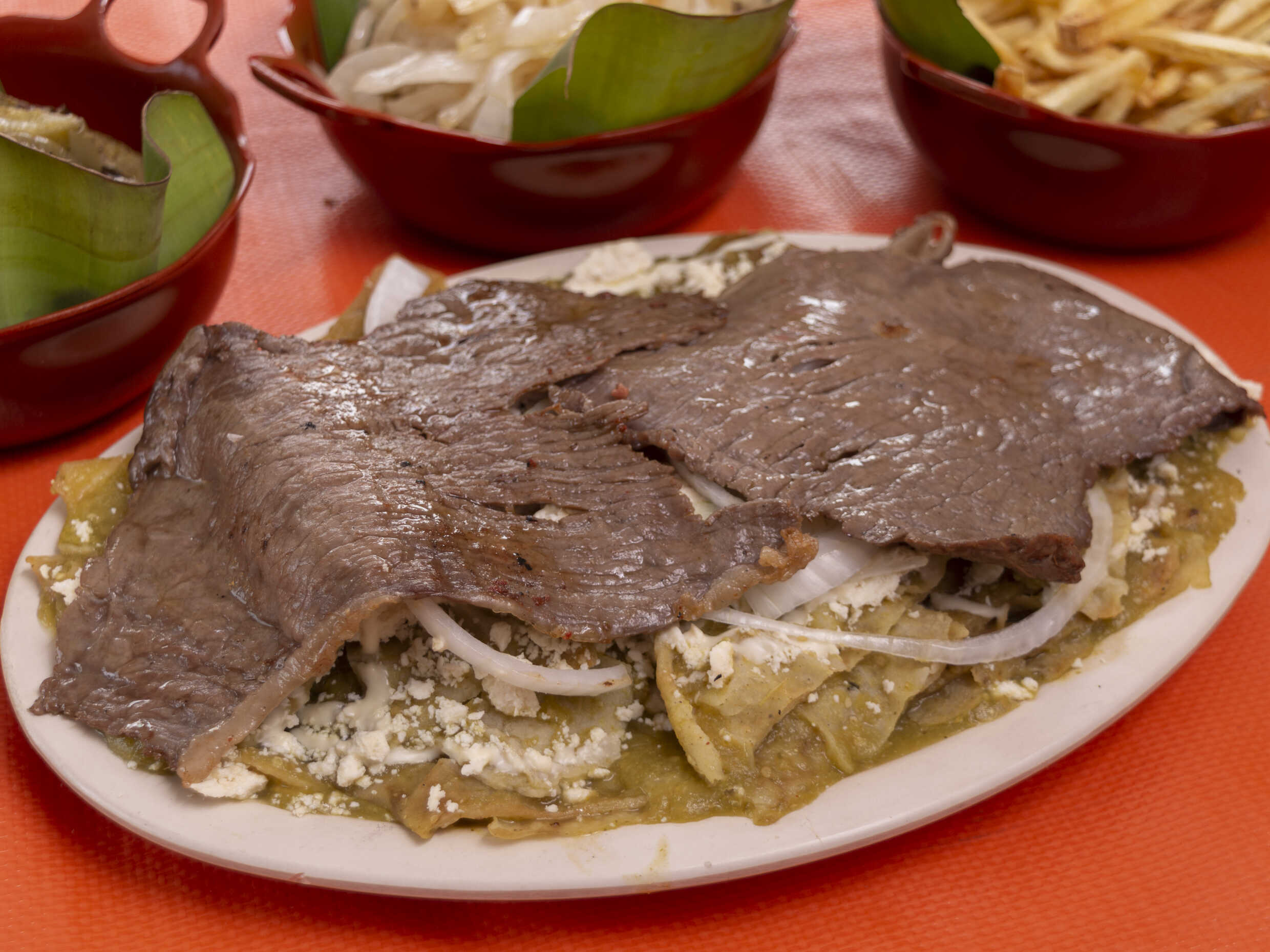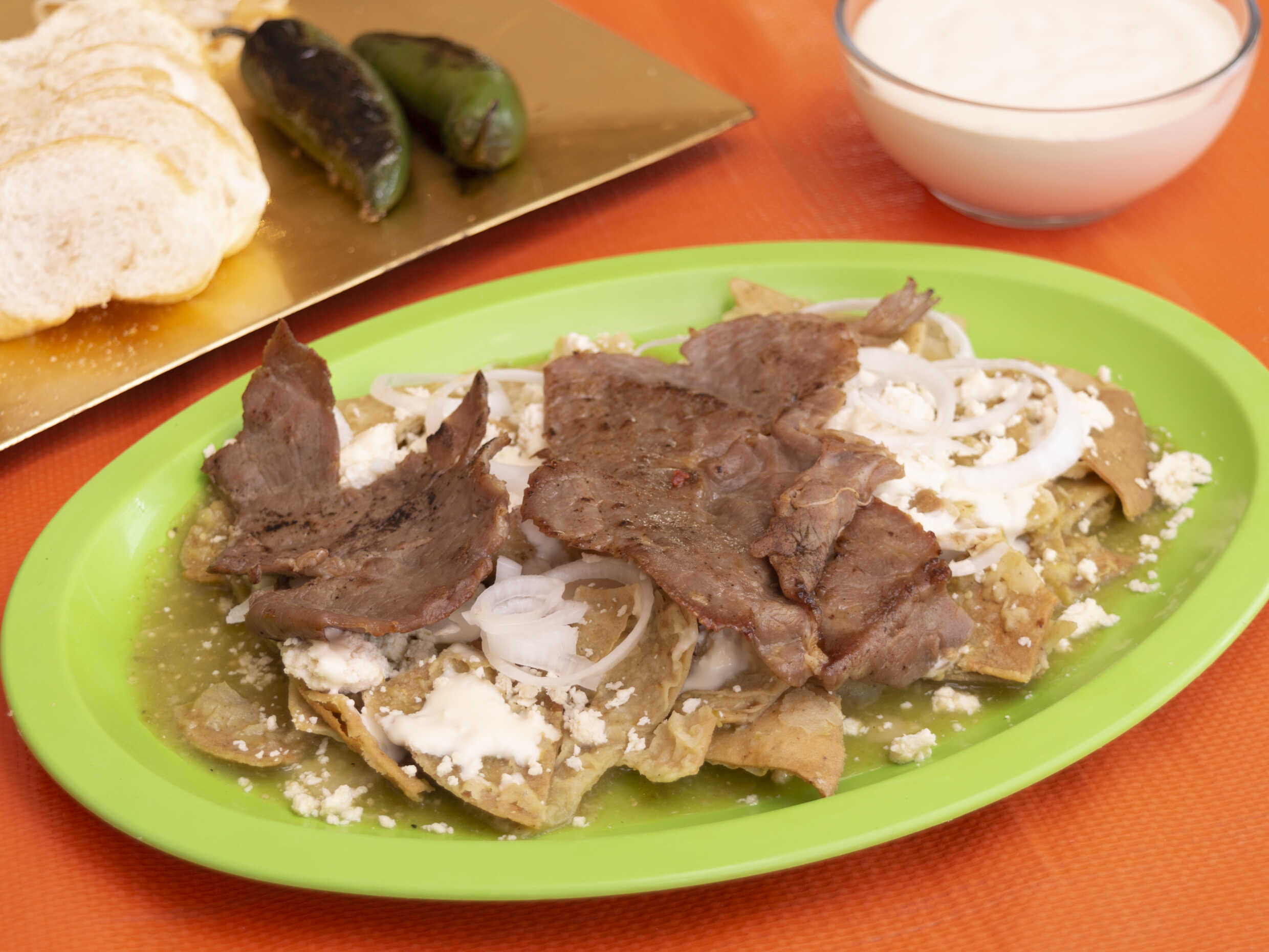 Totopos, salsa verde, queso, crema, cebolla y cecina a tu elección