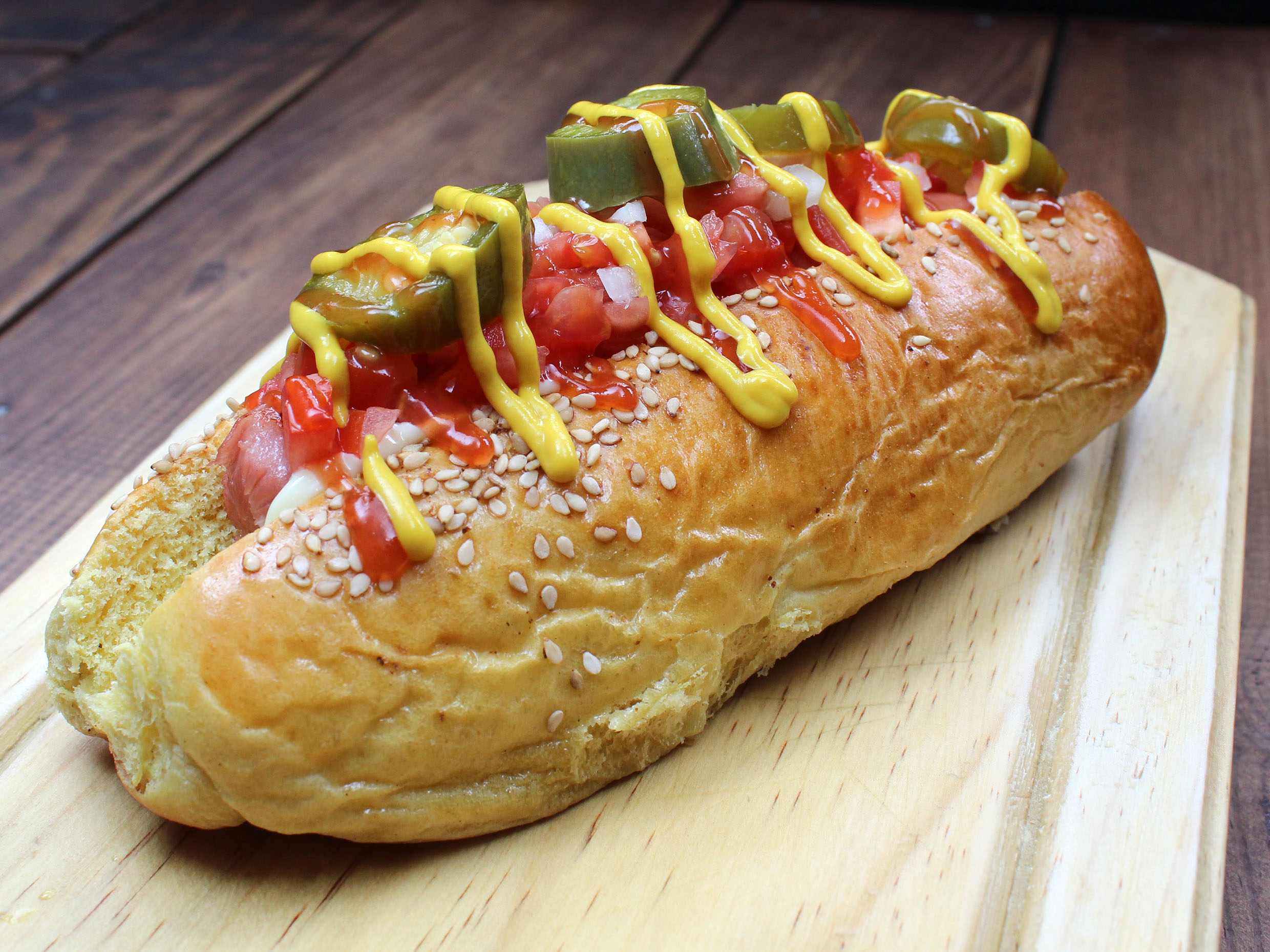 Salchicha, jitomate, cebolla y aderezos.