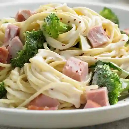 Pasta fusilli en salsa cremosa con pechuga de pavo y brócoli, incluye bebida del día 500 ml.