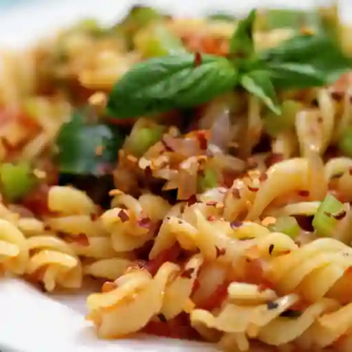 Pasta fusilli en salsa de tomate picosita con champiñones y queso parmesano, incluye bebida del día 500 ml.