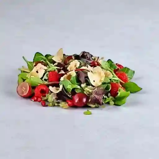 Mix de lechugas, queso cabra, fresas, zarzamoras, zanahoria, pepino, betabel, vinagreta de frutos rojos, incluye bebida del día 500 ml.