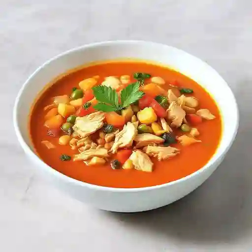 Sopita rica caliente con verduras en caldillo de jitomate y pechuga de pollo en tiras, incluye bebida del día 500 ml.