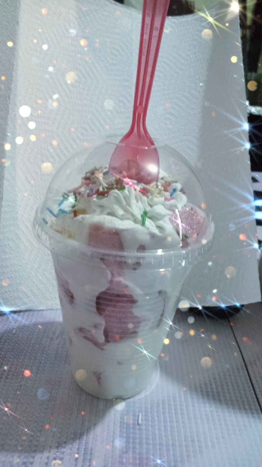 Deliciosas fresas congeladas partidas en cuadritos bañadas con crema batida, decoradas con chantily y granillo