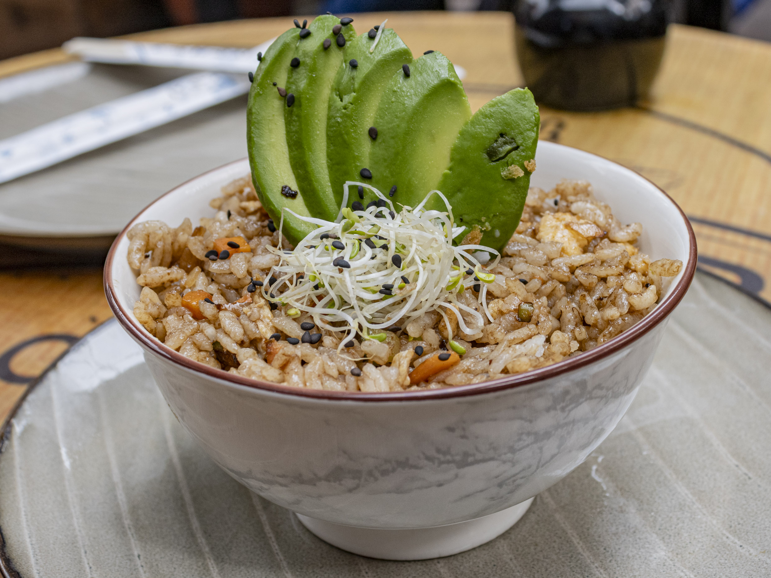 Arroz frito con calabaza, zanahoria,huevo cebollín y soya
